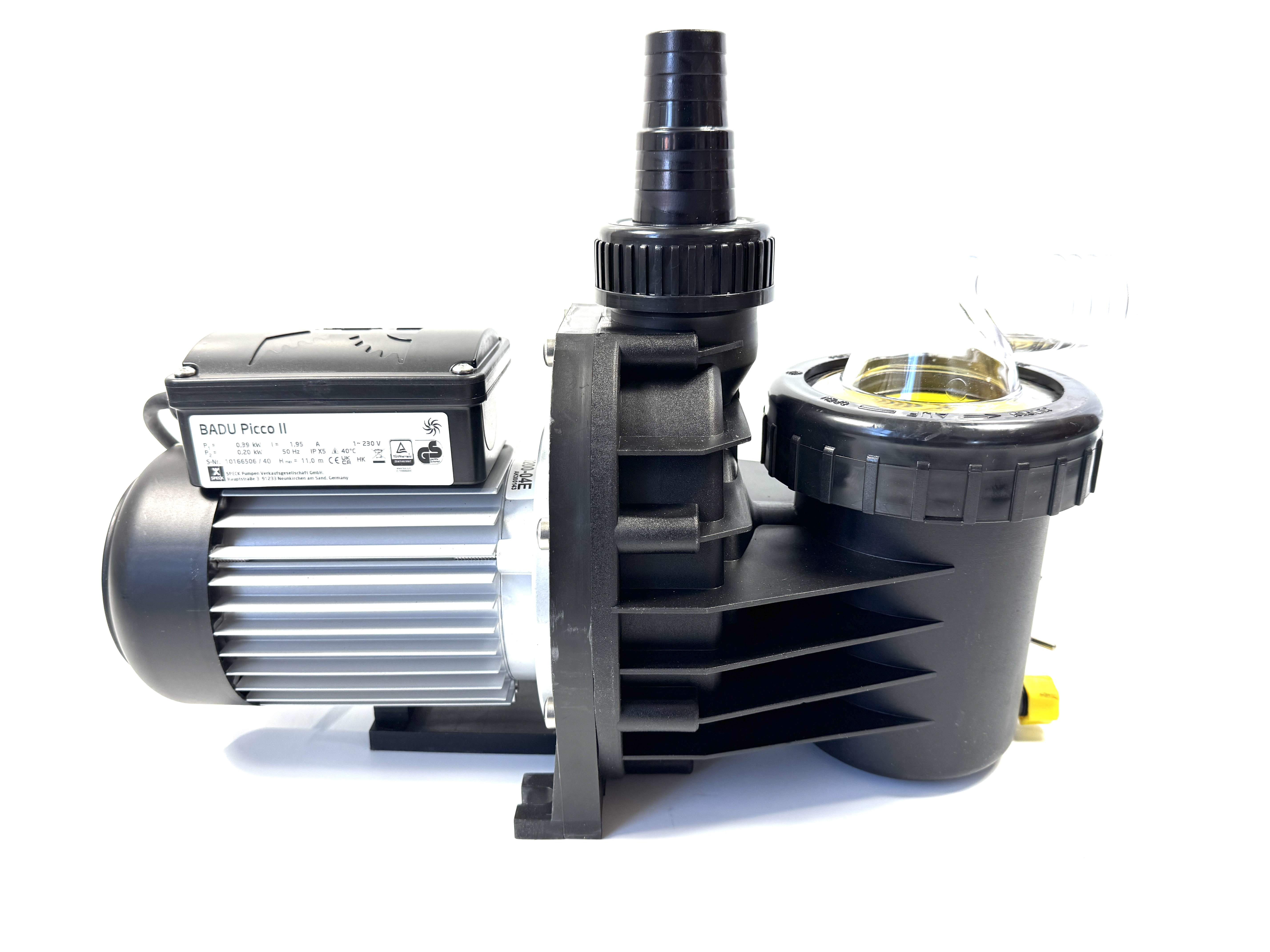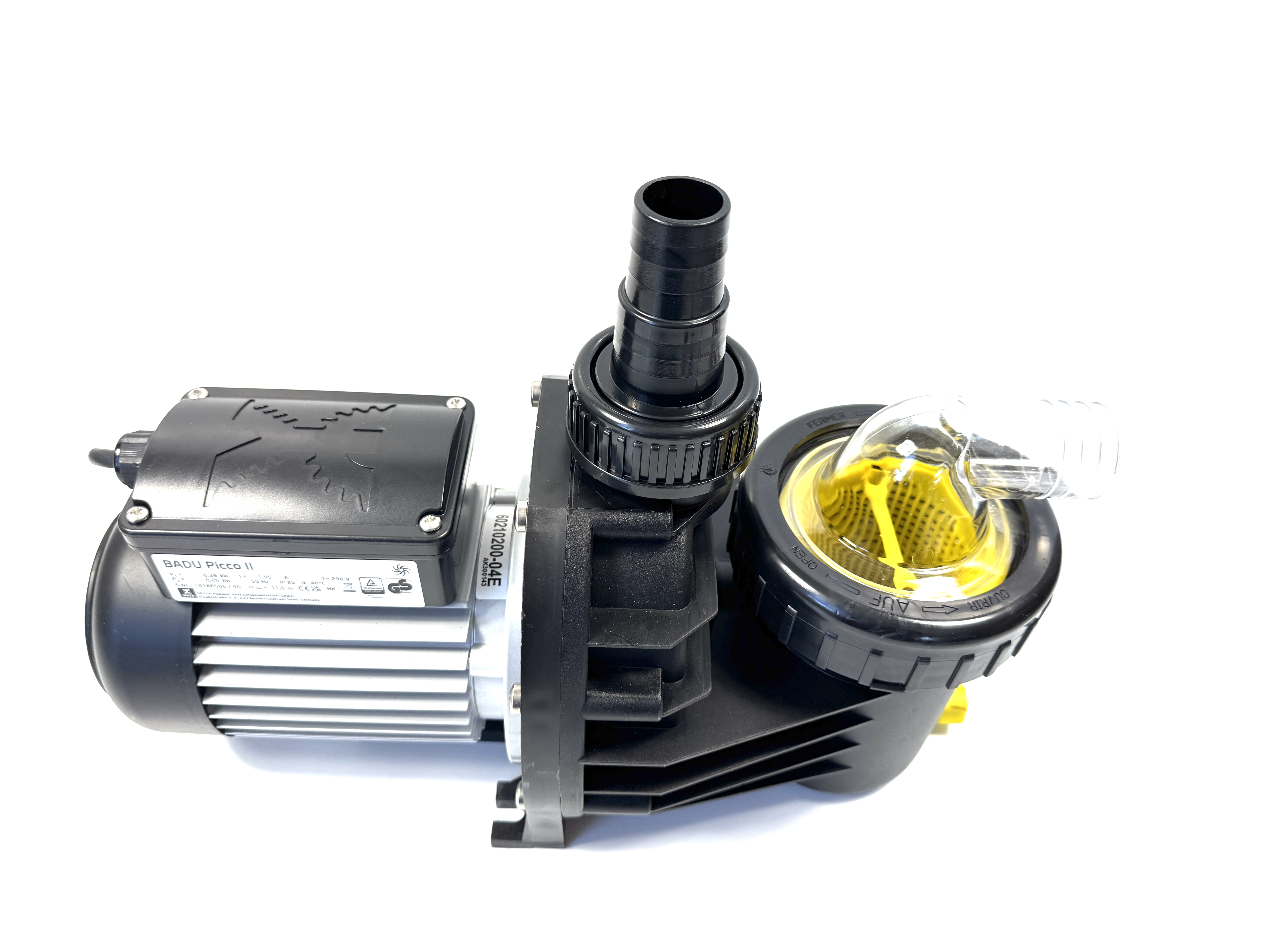 Die Kunststoffpumpen der Baureihe BADU Picco sind zur Umwälzung des Schwimmbadwassers in Kombination mit einer entsprechenden Filteranlage konzipiert. Die medienberührten Kunststoffteile sind überwiegend aus Polypropylen PP hergestellt und haben somit eine hervorragende Korrosionsbeständigkeit gegenüber dem Schwimmbadwasser und den zur Wasserpflege üblichen Wasserbehandlungsmitteln. Im Pumpengehäuse sind keine Inserts enthalten, somit ist dieses recyclingfähig. Die Motorwelle dient gleichzeitig als Pumpenwelle, auf der das Laufrad befestigt ist. Als Wellendichtung dient eine Balg-Gleitringdichtung, die auf der Laufradnabe aus Kunststoff sitzt. Hierdurch ist eine sichere Trennung zwischen Schwimmbadwasser und Elektromotor gegeben. Durch die Blockbauweise haben die Pumpen einen geringen Platzbedarf. Sie werden durch Wechselstrommotoren angetrieben. Im Pumpengehäuse ist ein Saugsieb (143) integriert, das gröbere Verunreinigungen aus dem Pumpeninneren fernhält.