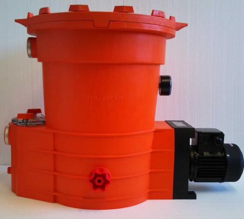 Der BADU Star 913/12 Dr. in Drehstromausführung ist für die Schwimmbadwasser-Filtration in Privatbädern konzipiert. Die Pumpe des BADU STAR ist selbstansaugend (bis ca. 3 m geodätisch) und fördert das Badewasser vom Schwimmbecken über seinen vorgeschalteten Fasernfänger (für Blätter u.ä.), drückt es durch die ca. 50 μm feinen Filterkerzen, um es klar gereinigt ins Becken zurückzupumpen. Am Manometer ist der Verschmutzungsgrad der Filterkerzen ablesbar. Diese Polystar Filterkerzen können leicht ausgebaut und durch Absprühen oder auch in der Waschmaschine (bis 30°C) gereinigt werden. Nicht schleudern! Die medienberührten Teile des BADU STAR sind überwiegend aus glasfaserverstärktem Kunststoff hergestellt und haben damit eine exzellente Korrosionsbeständigkeit gegenüber dem Schwimmbadwasser und den zur Wasserpflege üblichen Wasserbehandlungsmitteln. Die Motorwelle dient gleichzeitig als Pumpenwelle, auf der das Laufrad befestigt ist. Als Wellendichtung dient eine Balg-Gleitringdichtung, die auf einer Wellenschutzhülse sitzt. Hierdurch ist eine sichere Trennung zwischen Schwimmbadwasser und Elektromotor gegeben. Durch die optimale Wasserführung und die niedrige Filtergeschwindigkeit erreichen Sie bei richtigem Einbau des BADU STAR einen hohen Wirkungsgrad.