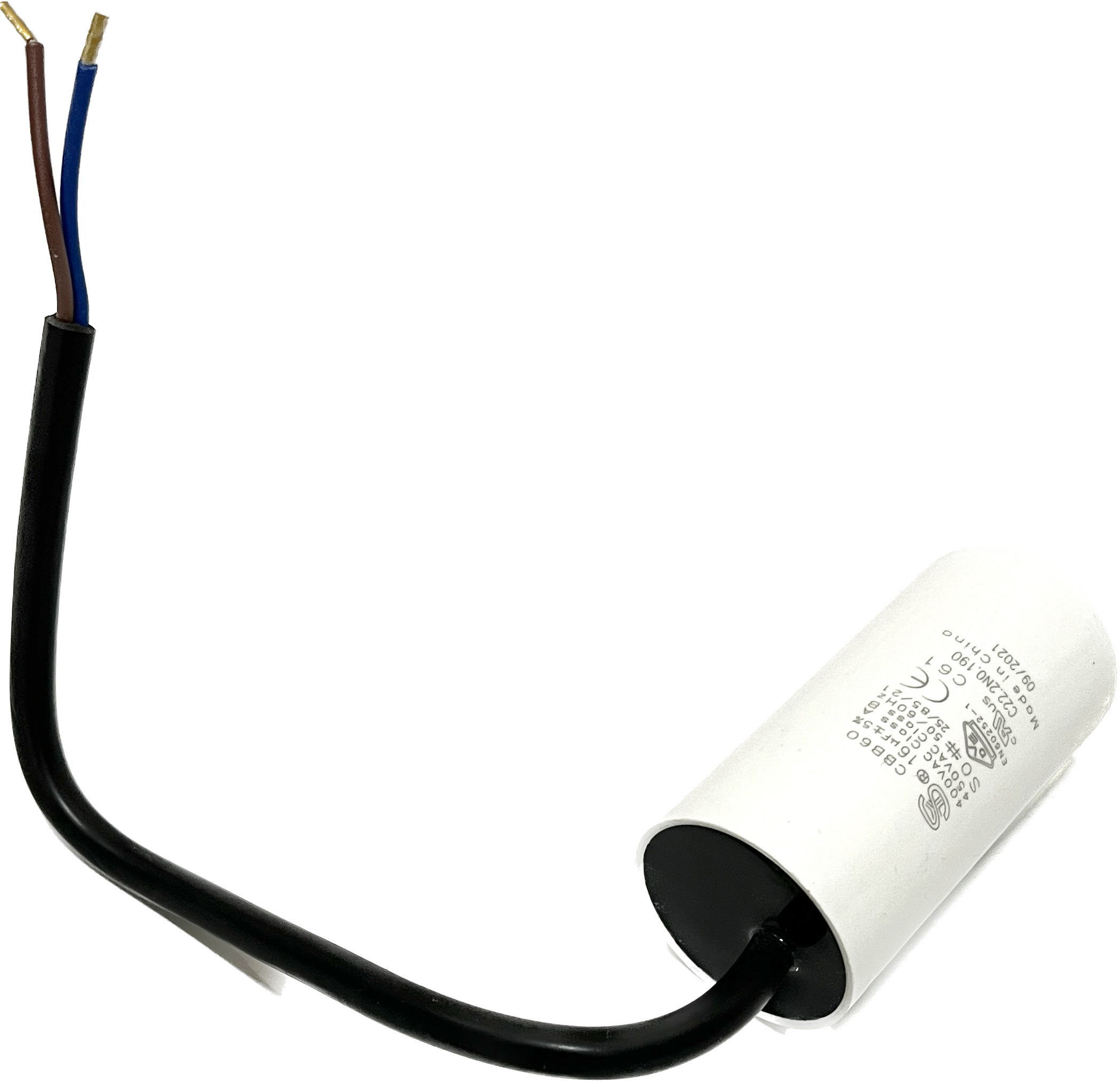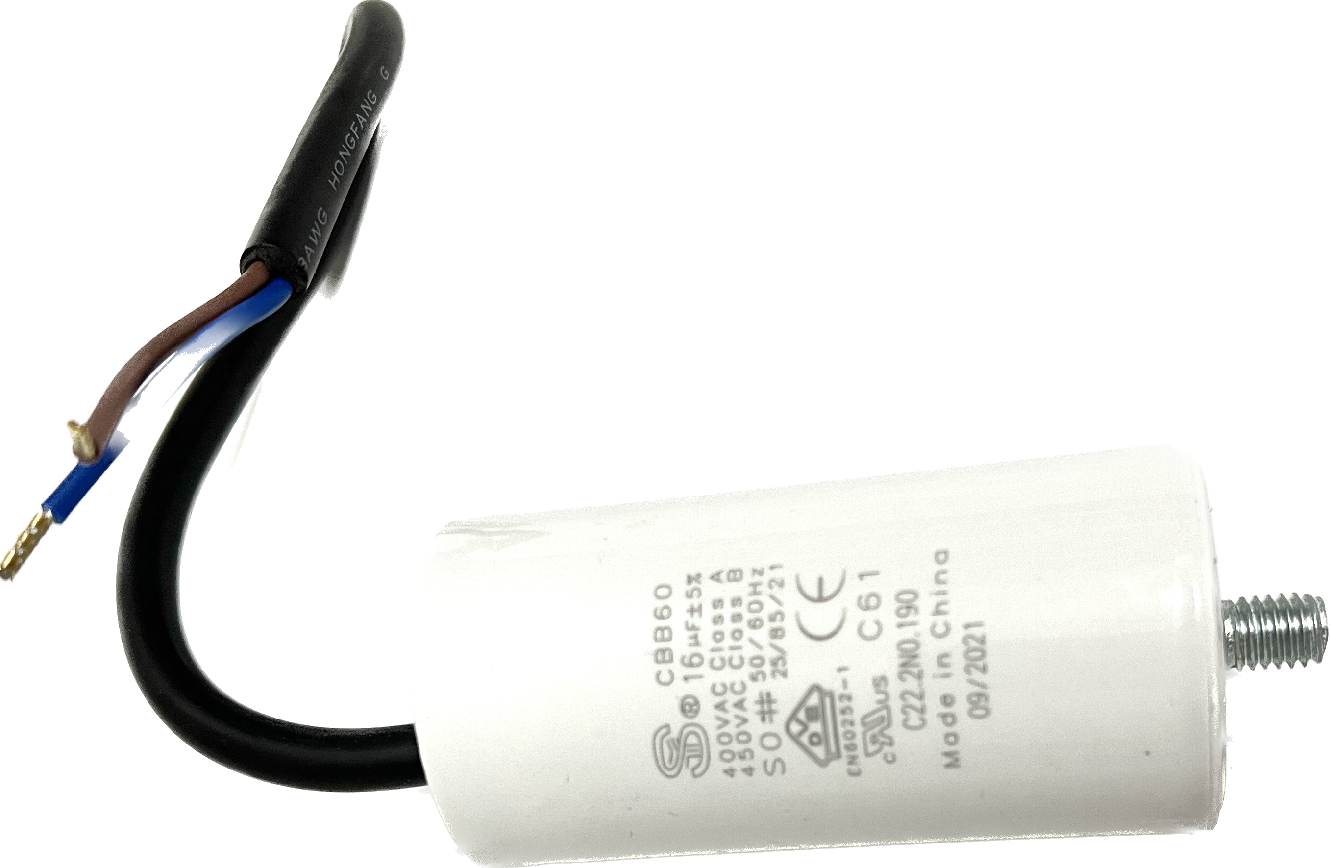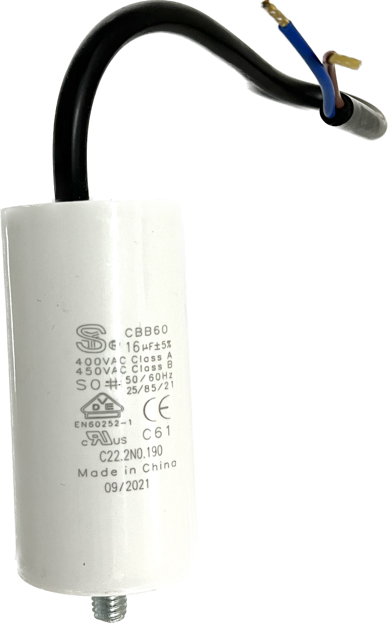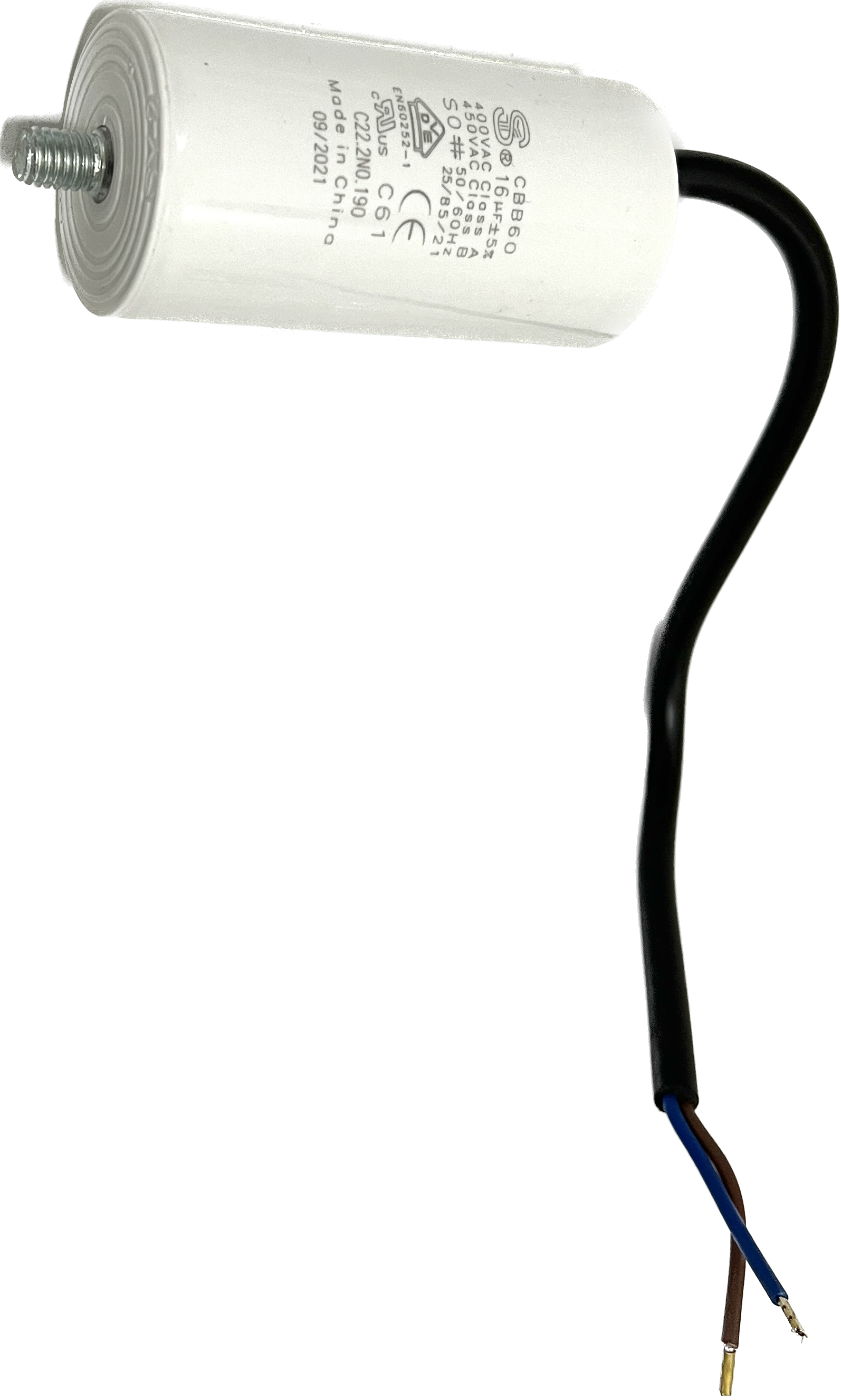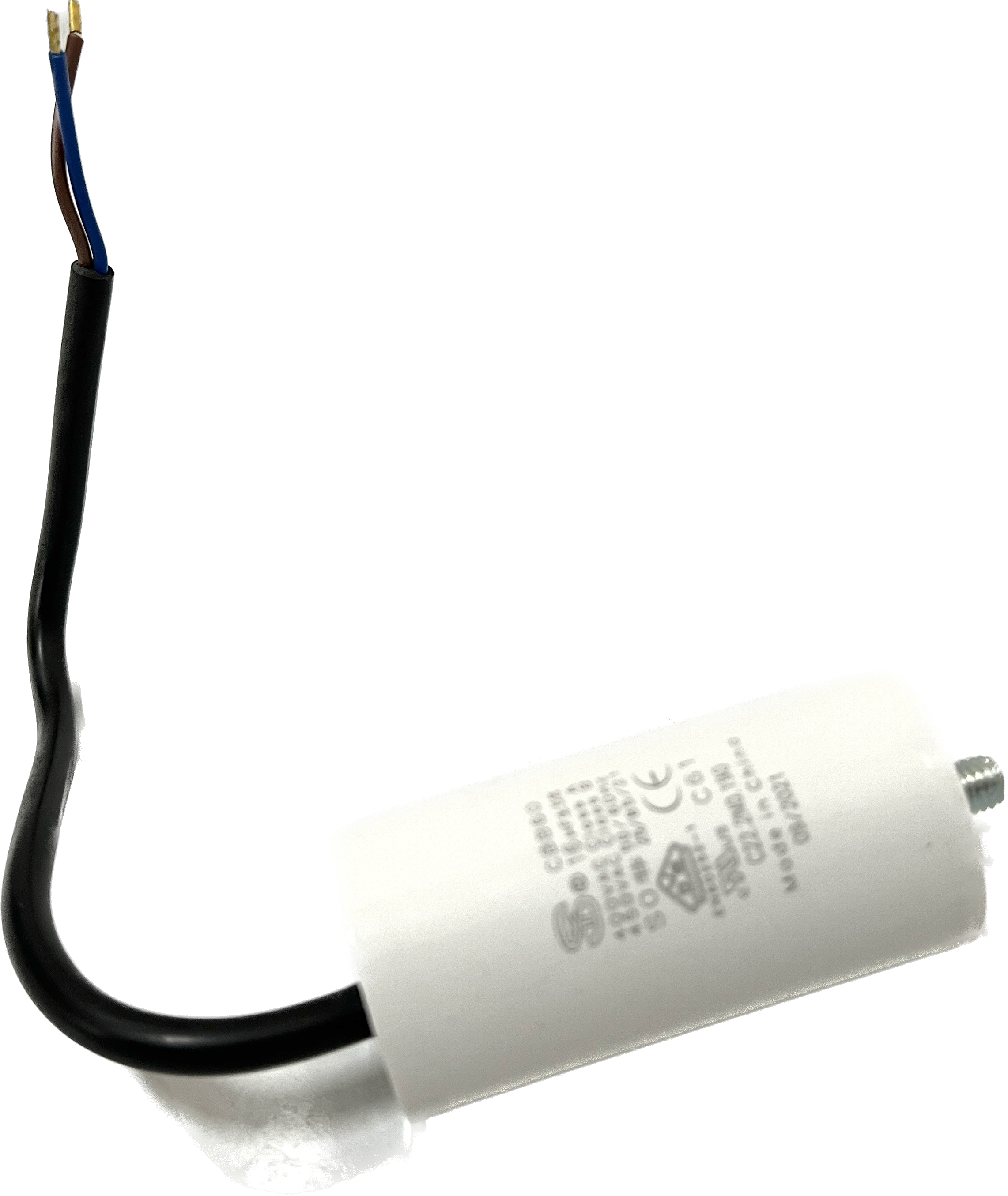 Kondensator mit Bolzen, 16 µF +/- 5%, S0, 50-60 Hz, 40 x 80 mm, M8 Bolzen, Kabellänge 250 mm, 40 mm davon abgemantelt mit Aderendhülsen, alternativ für Kondensatorrohre mit Schraubgewinde geeignet, für BADU Top 14, Bettar 14,Super Pump 14 (bis ca. 12/16), BADU Magic 8, BADU Magic 11, Bettar 12, BADU Top 12, Super Pump 12, BADU 90/13, BADU Bronze 14, BADU 40/6 (ab 1/95 für 0,3 kW), BADU 40/7 (ab 1/95 für 0,3 kW), BADU 42/6 (ab 1/95 für 0,3 kW), BADU 90/7 (ab 1/95 für 0,3 kW), BADU Star 69 (ab 1/95 für 0,3 kW), BADU Bronze 7 (ab 1/95 für 0,3 kW), BADU 40/9 (ab 1/95), BADU 40/11 (ab 1/95), BADU 42/9 (ab 1/95), BADU Bronze 11 (ab 1/95), BADU 90/11 (ab 1/95), BADU Star 913 (ab 1/95), als Ersatz für defekte Motorkondensatoren