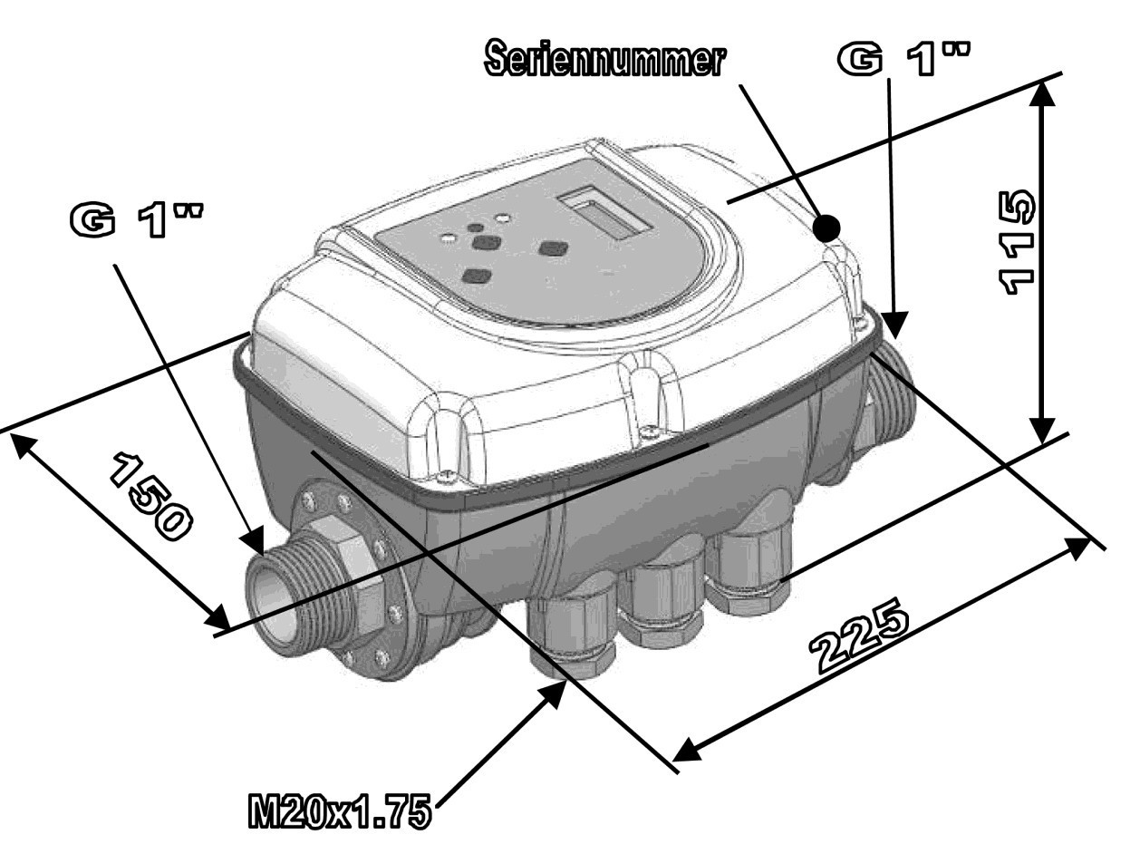 - Druckschalter umschaltbar zwischen Modus Einschaltdruck - Ausschaltdruck (Membrangefäß erforderlich) und Modus Einschaltdruck – Ausschalten bei Durchfluss = 0 (kein Membrangefäß erforderlich), Fehlerspeicher und Frostschutzfunktion