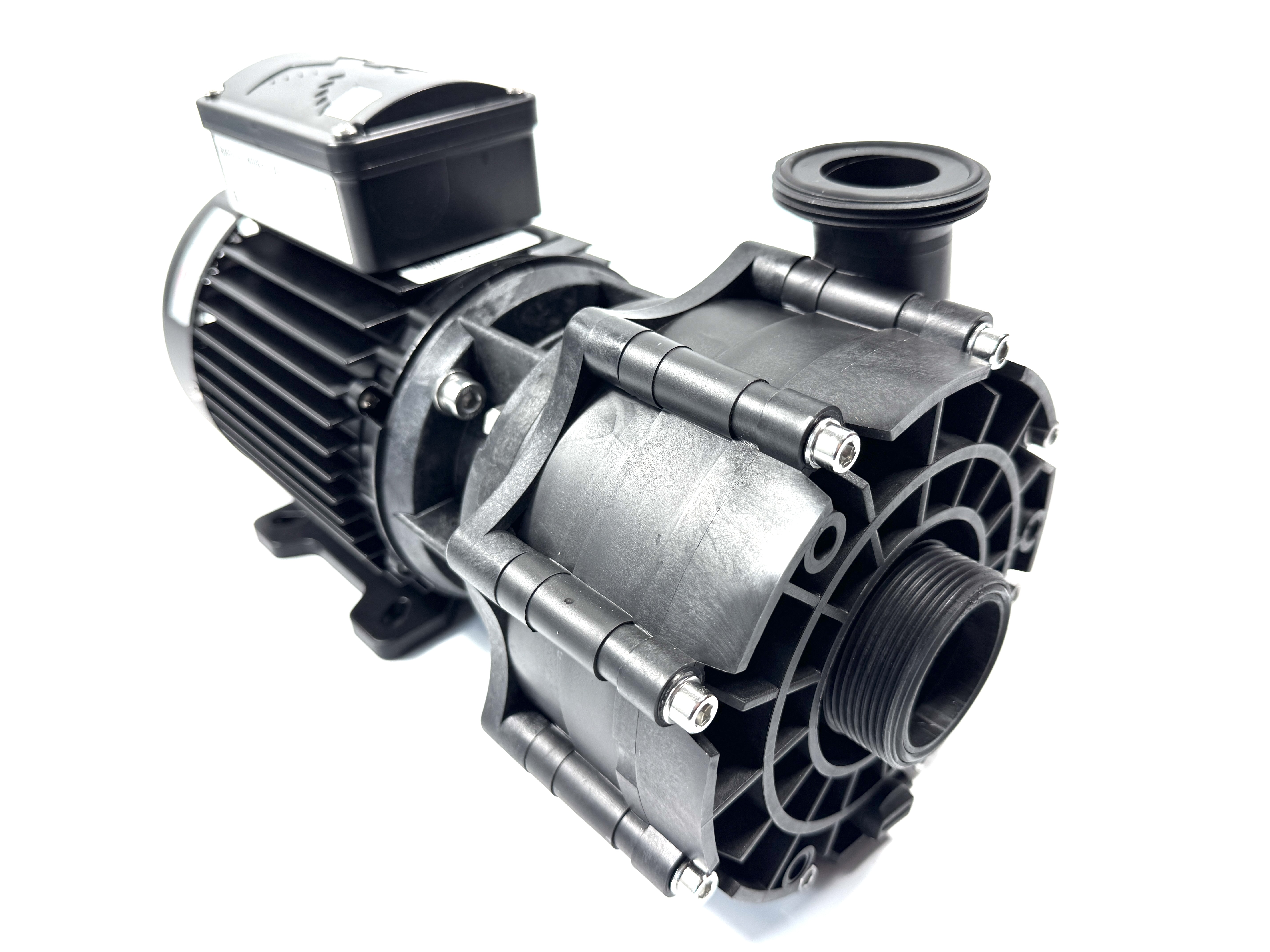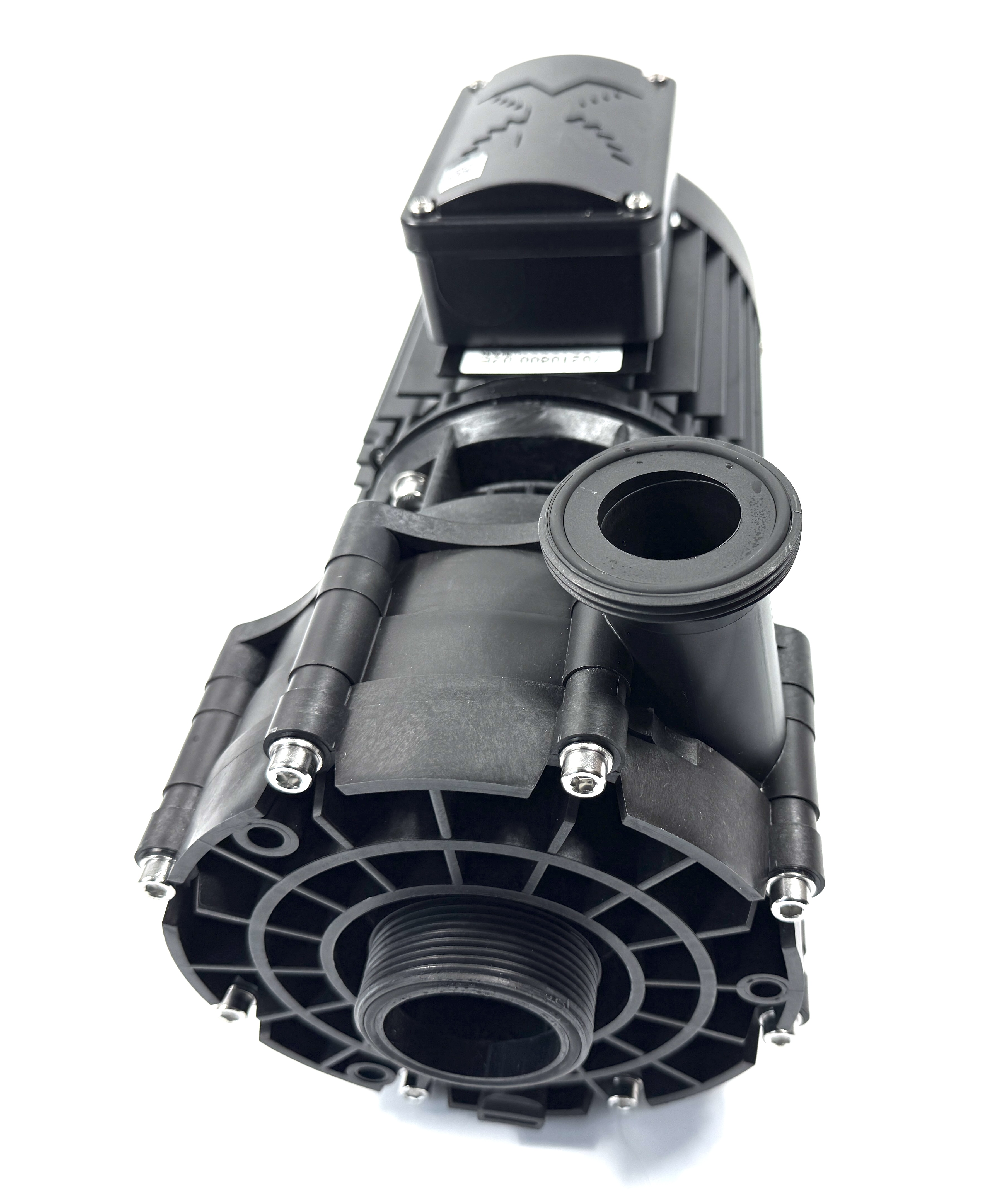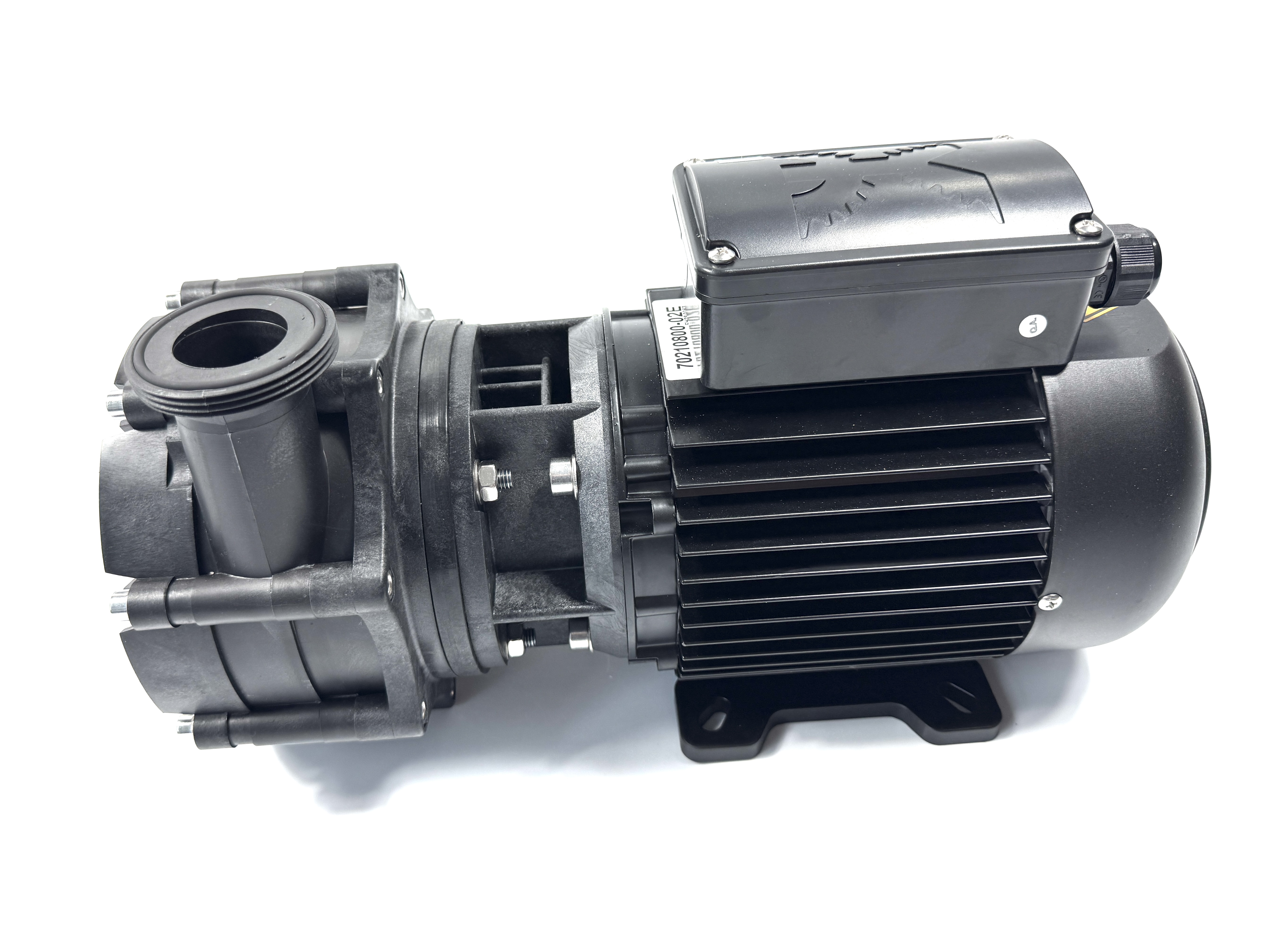 Monoblock-type pump with a closed bellows-type mechanical seal mounted on a plastic shaft protector sleeve. Motor/pump shaft has no contact with the pool water! Complete electrical separation.