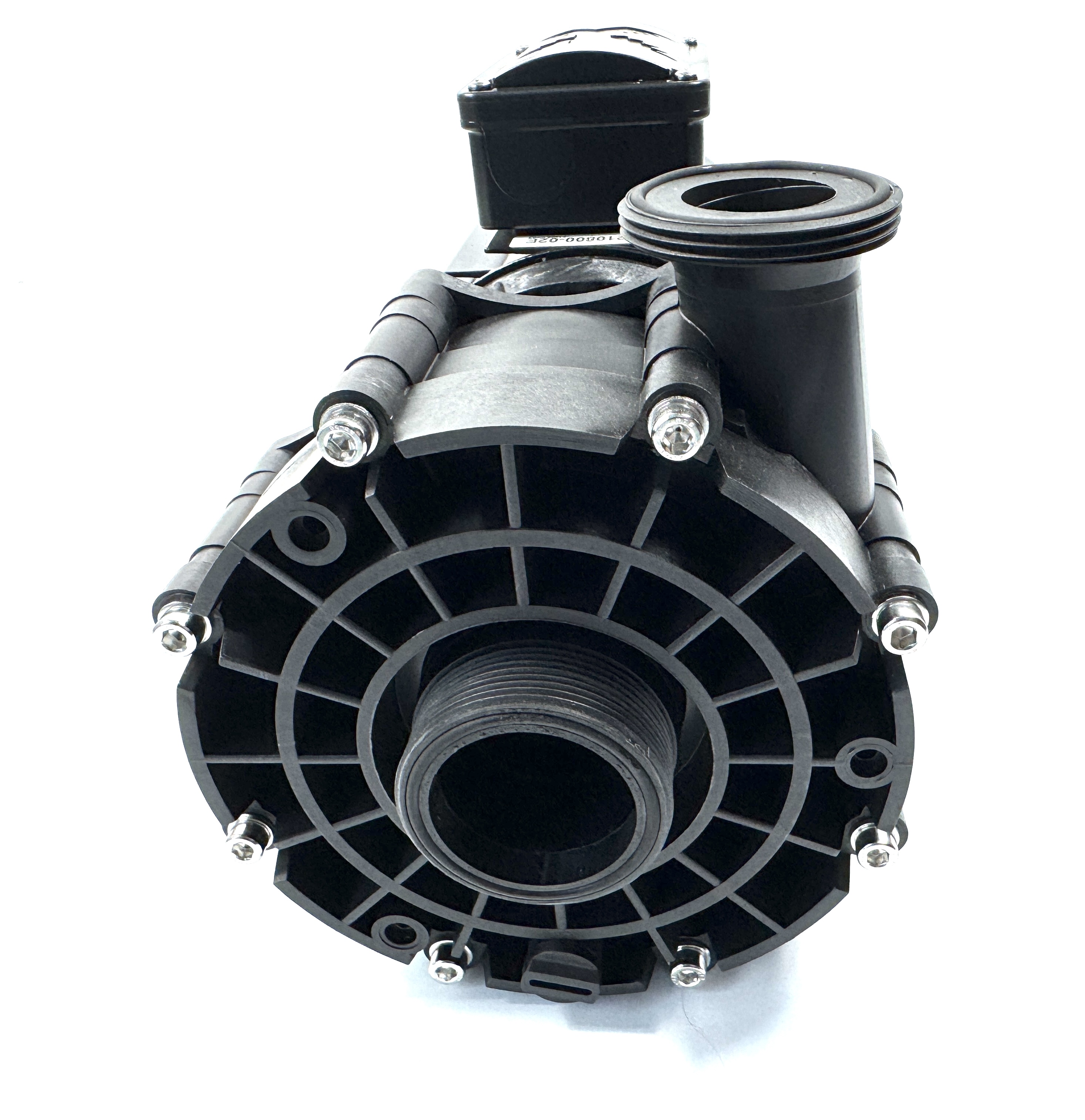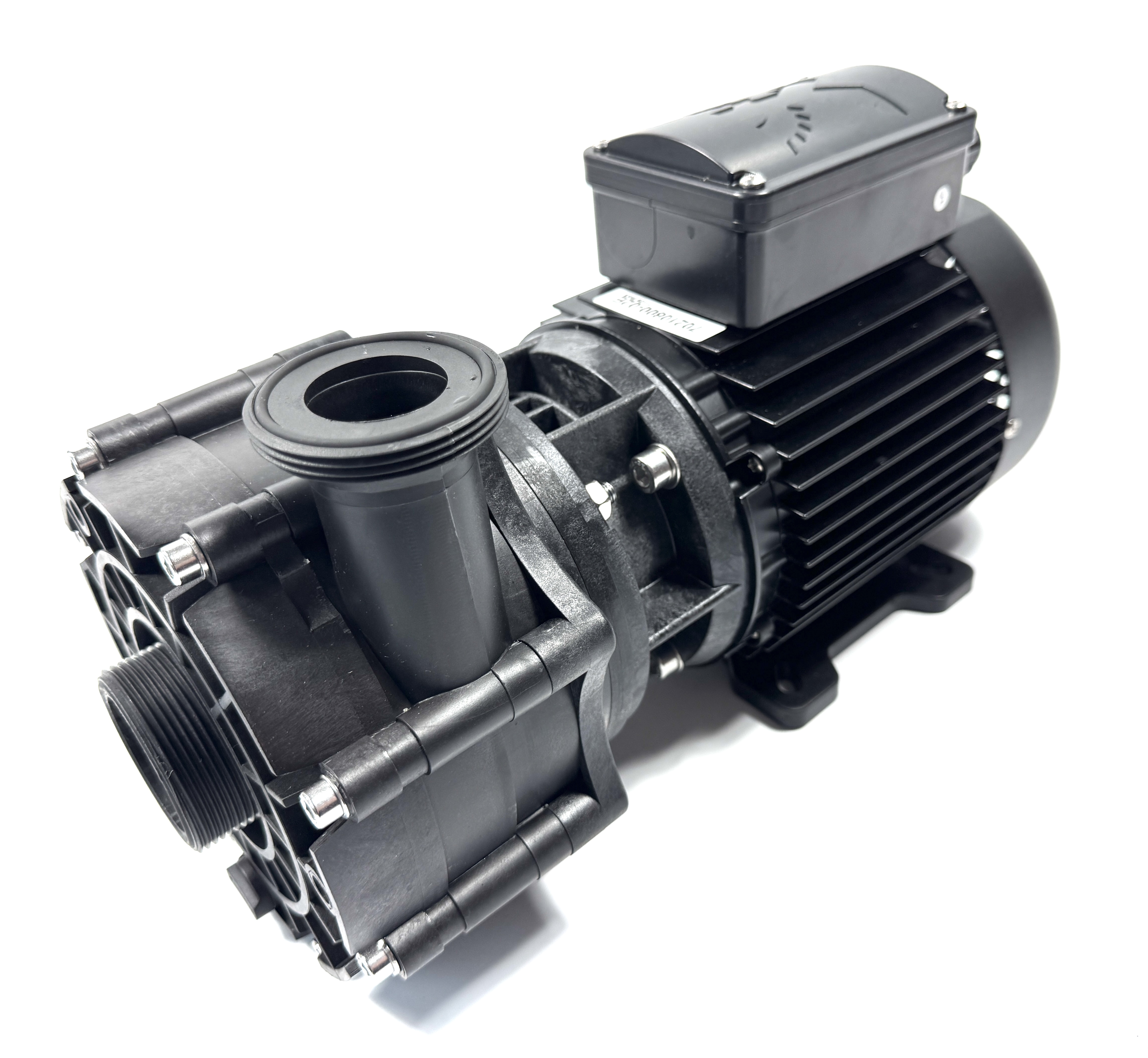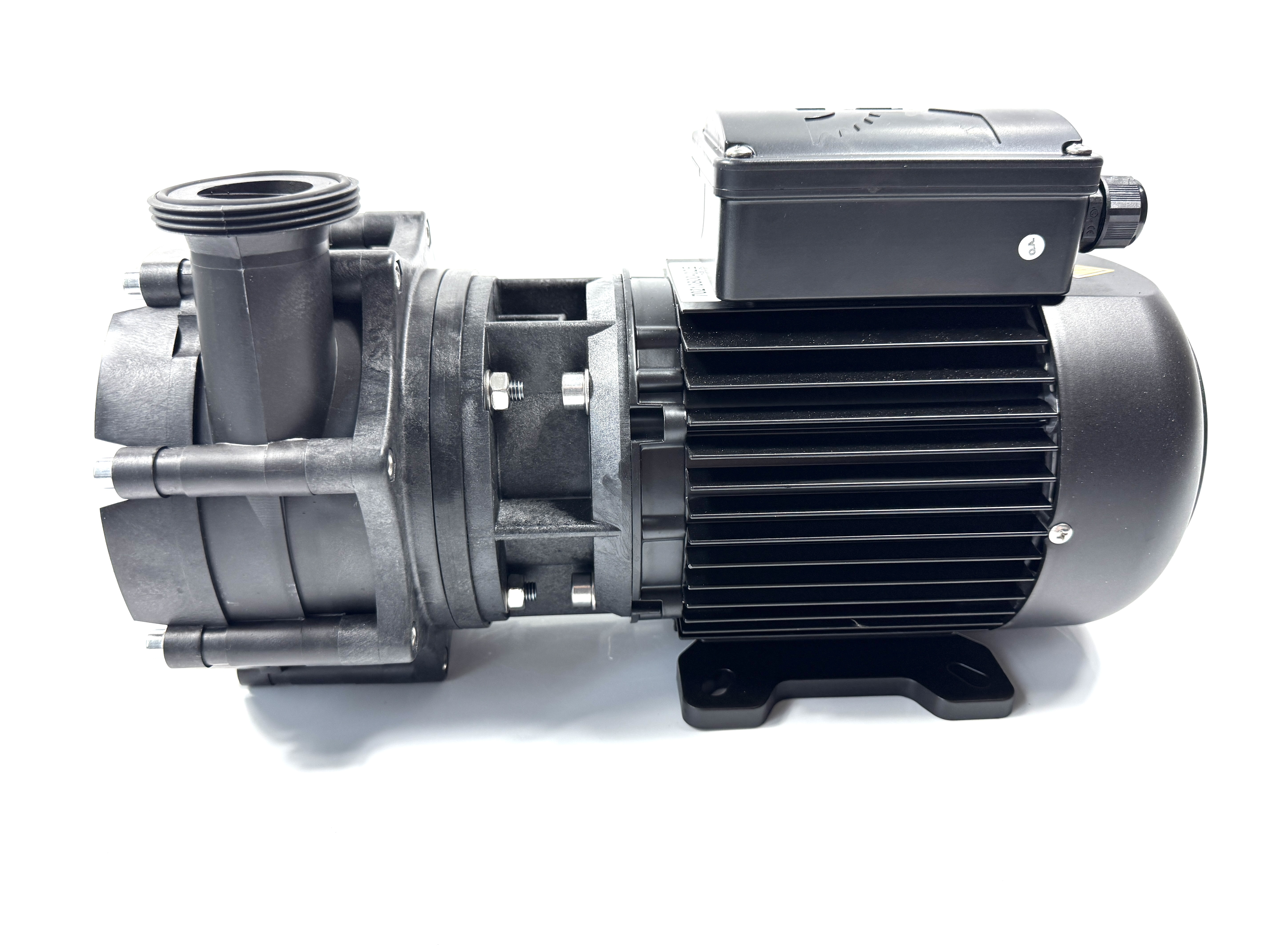 Monoblock-type pump with a closed bellows-type mechanical seal mounted on a plastic shaft protector sleeve. Motor/pump shaft has no contact with the pool water! Complete electrical separation.
