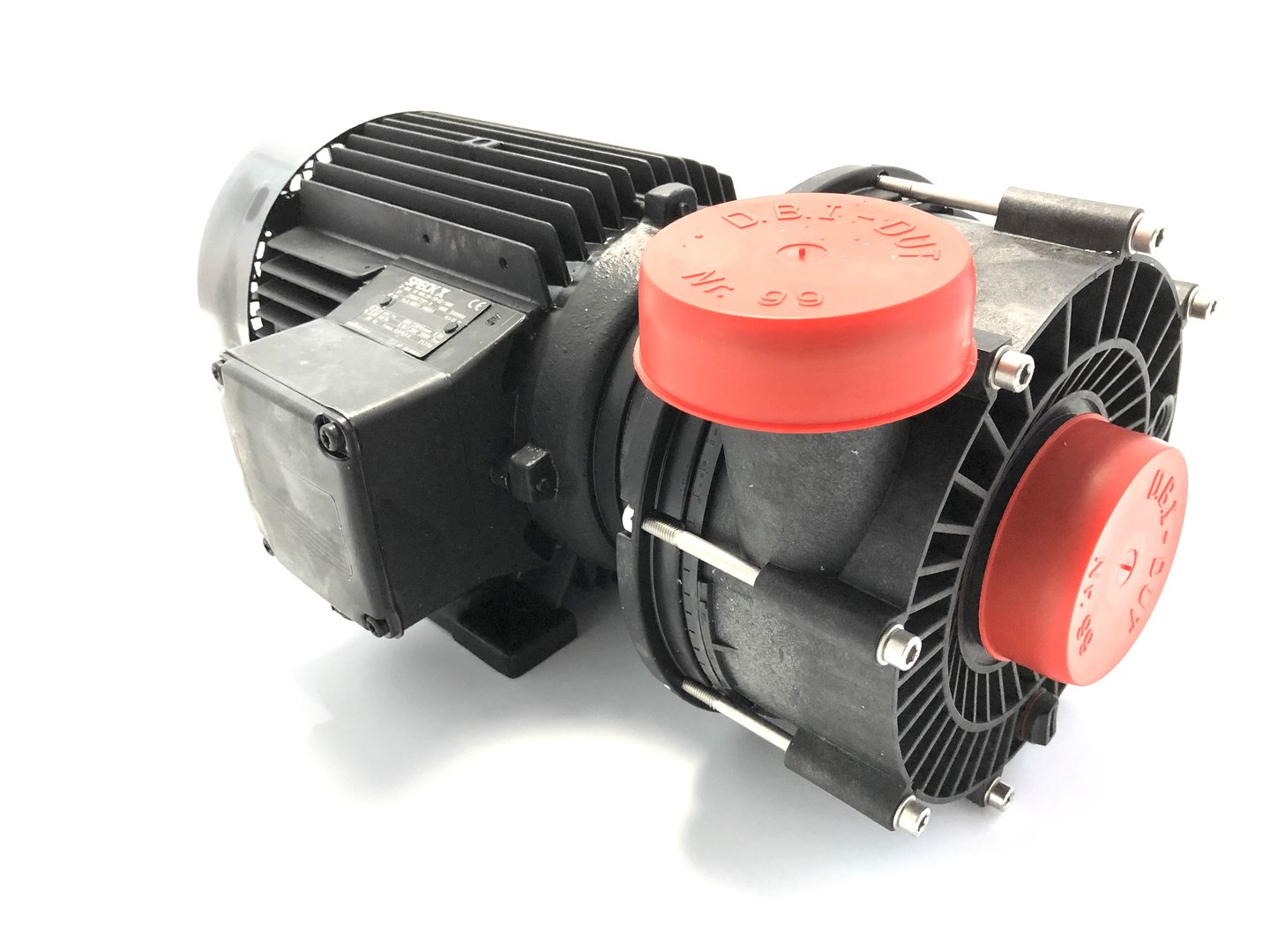 Monoblock-type pump with a closed bellows-type mechanical seal mounted on a plastic shaft protector sleeve. Motor/pump shaft has no contact with the pool water! Complete electrical separation.