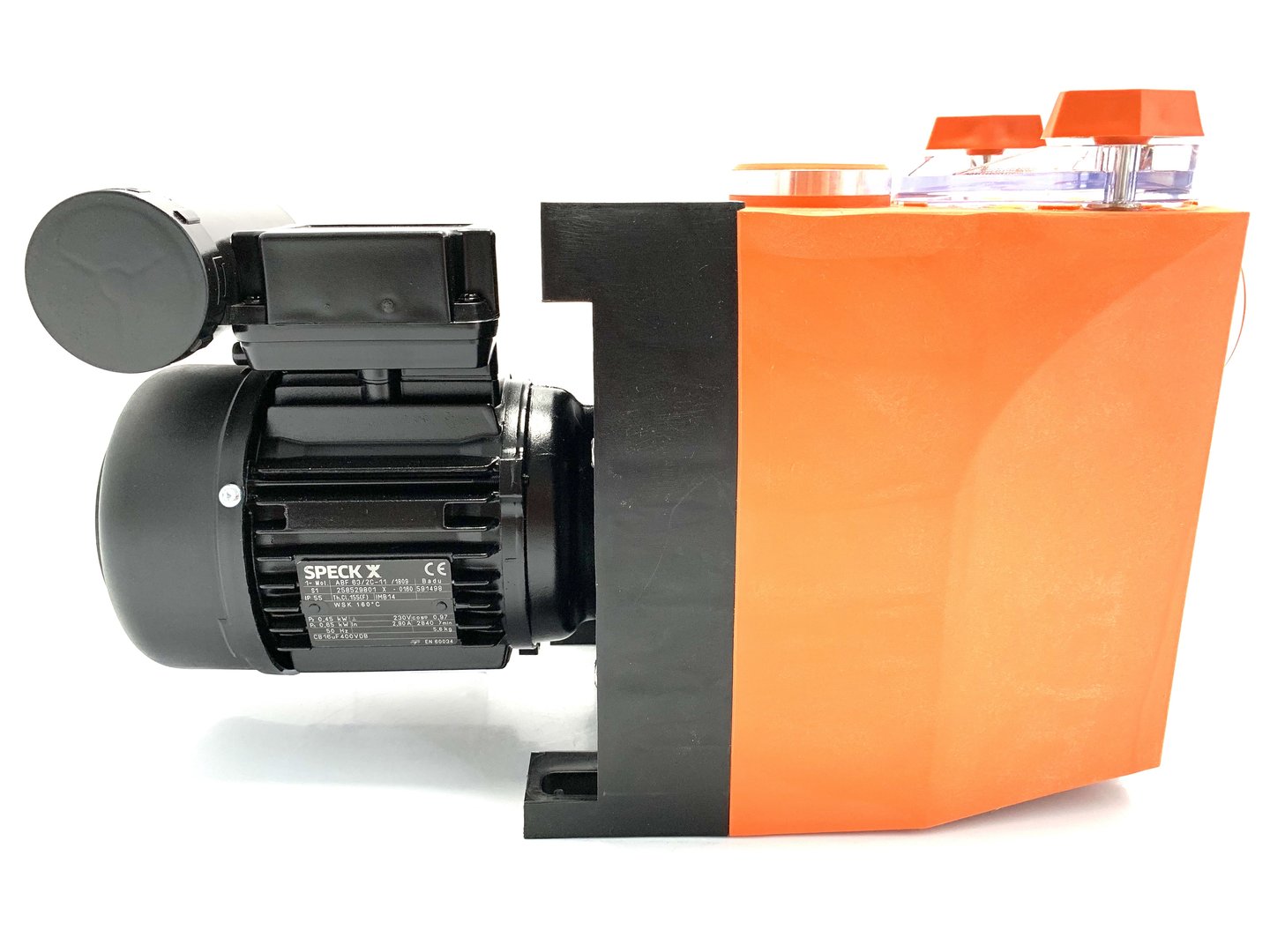 Monoblock-type pump with integrated strainer tank. The bellow-type mechanical seal is mounted on a plastic shaft protector sleeve.