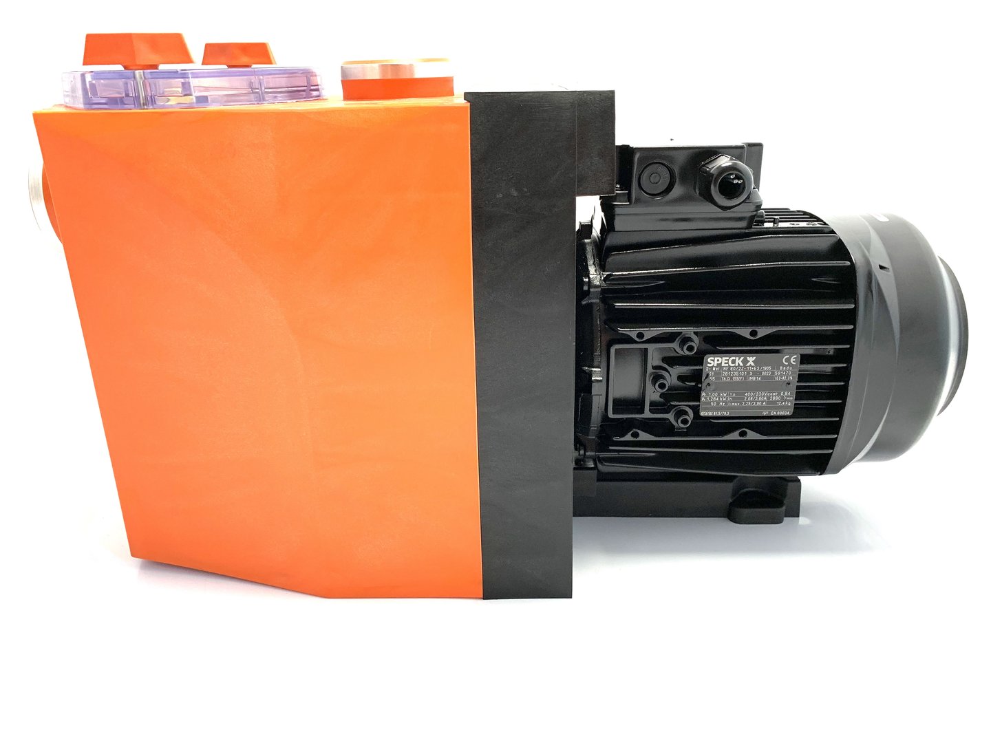 Monoblock-type pump with integrated strainer tank. The bellow-type mechanical seal is mounted on a plastic shaft protector sleeve.