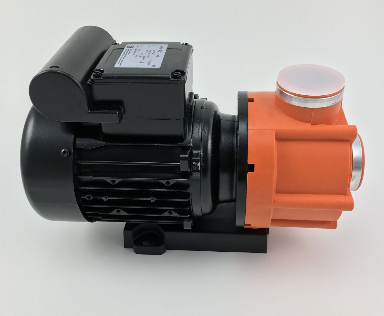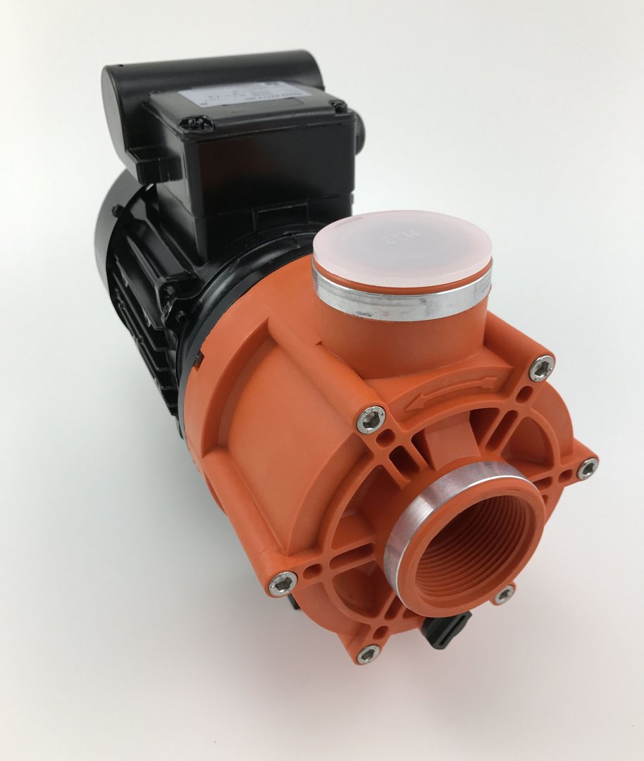 Monoblock-type pump with a closed bellows-type mechanical seal mounted on a plastic shaft protector sleeve. Motor/pump shaft has no contact with the pool water! Complete electrical separation.
