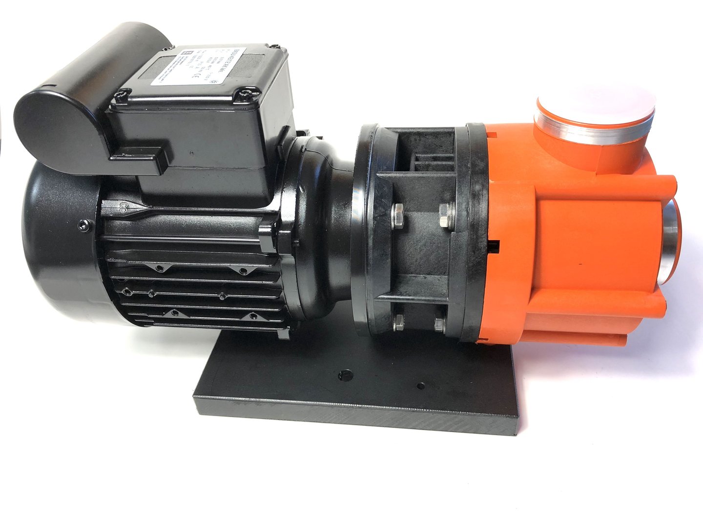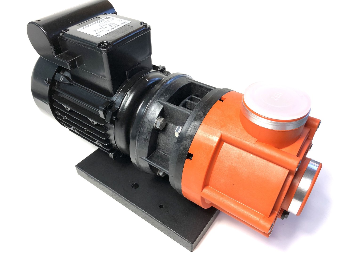 Monoblock-type pump with a closed bellows-type mechanical seal mounted on a plastic shaft protector sleeve. Motor/pump shaft has no contact with the pool water! Complete electrical separation.