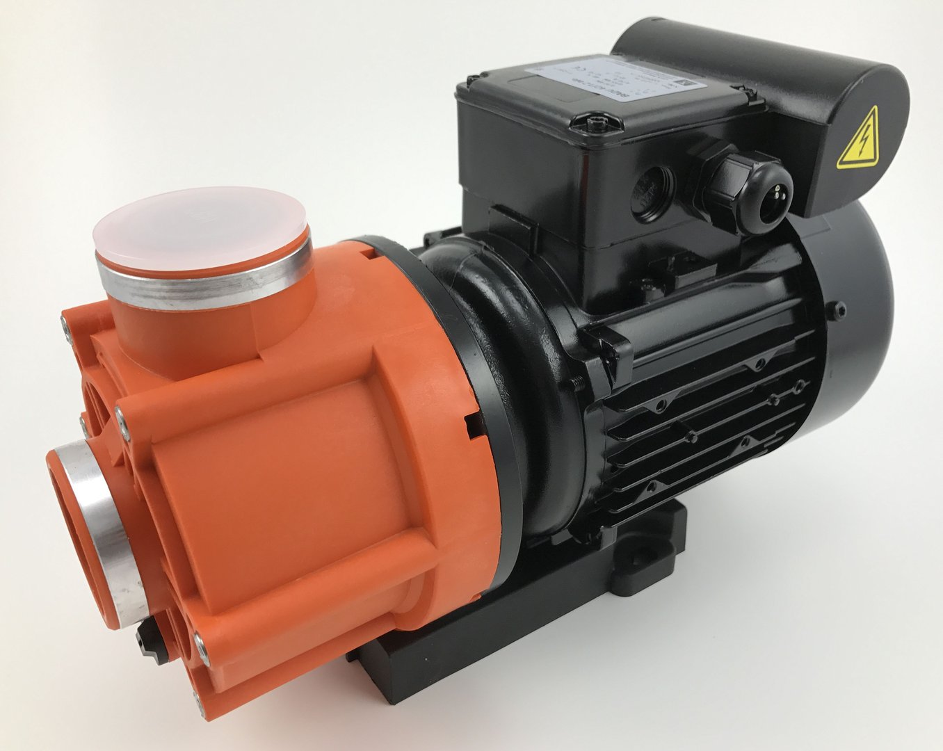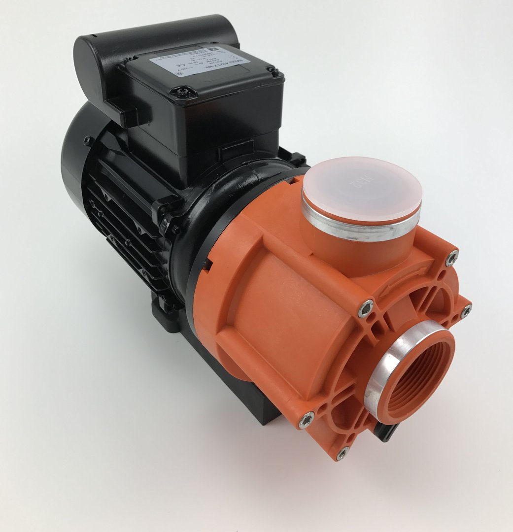 Monoblock-type pump with a closed bellows-type mechanical seal mounted on a plastic shaft protector sleeve. Motor/pump shaft has no contact with the pool water! Complete electrical separation.