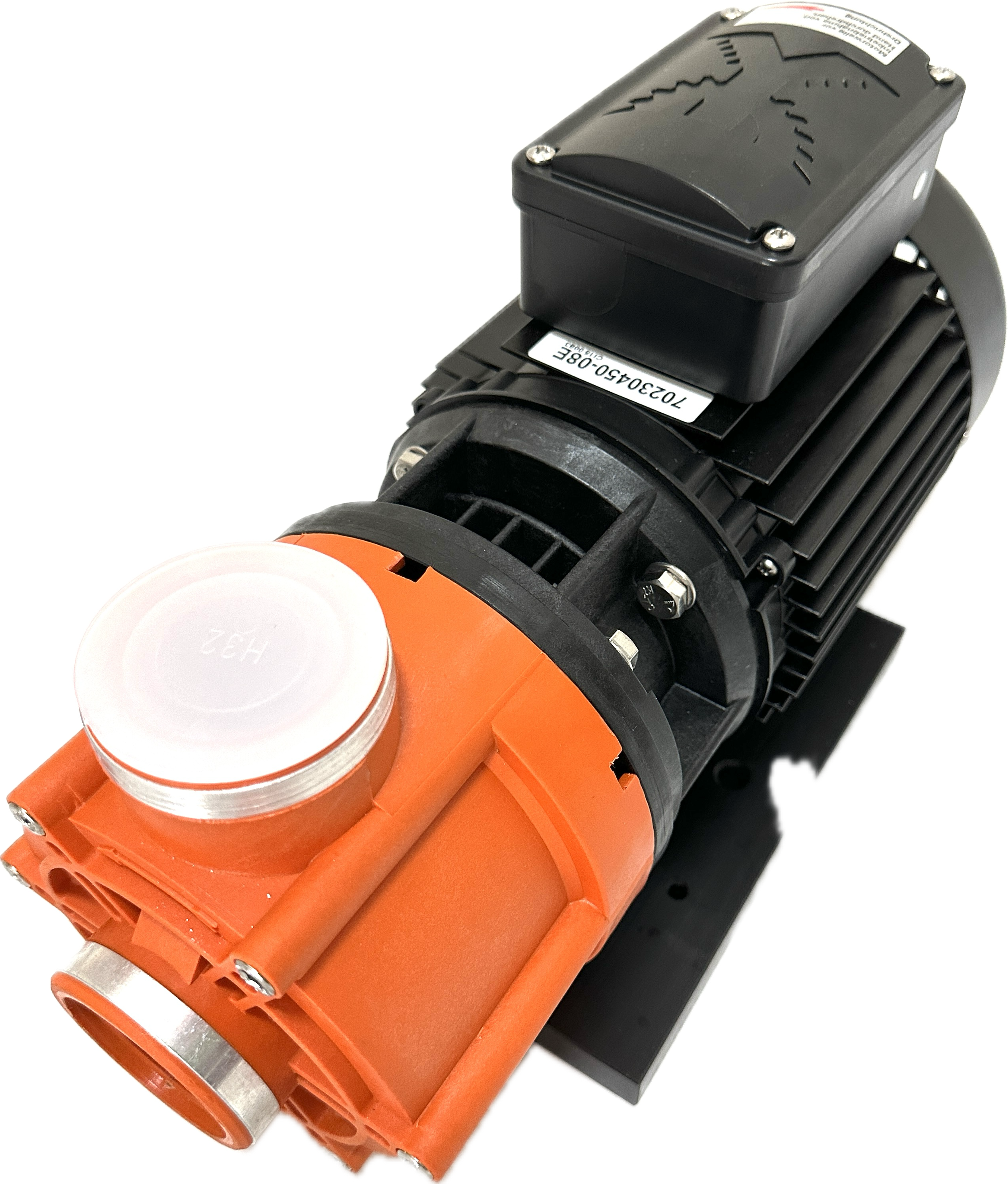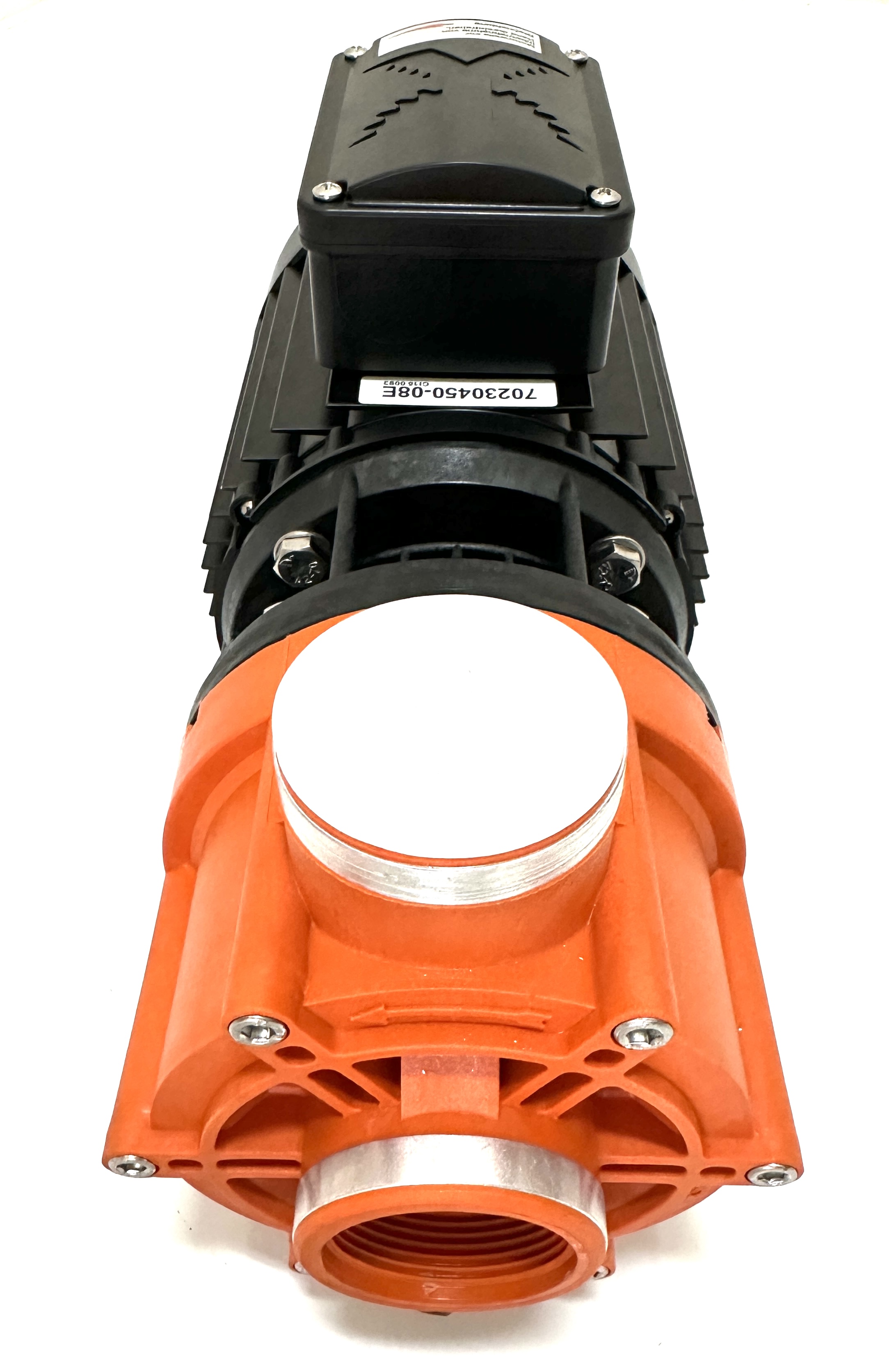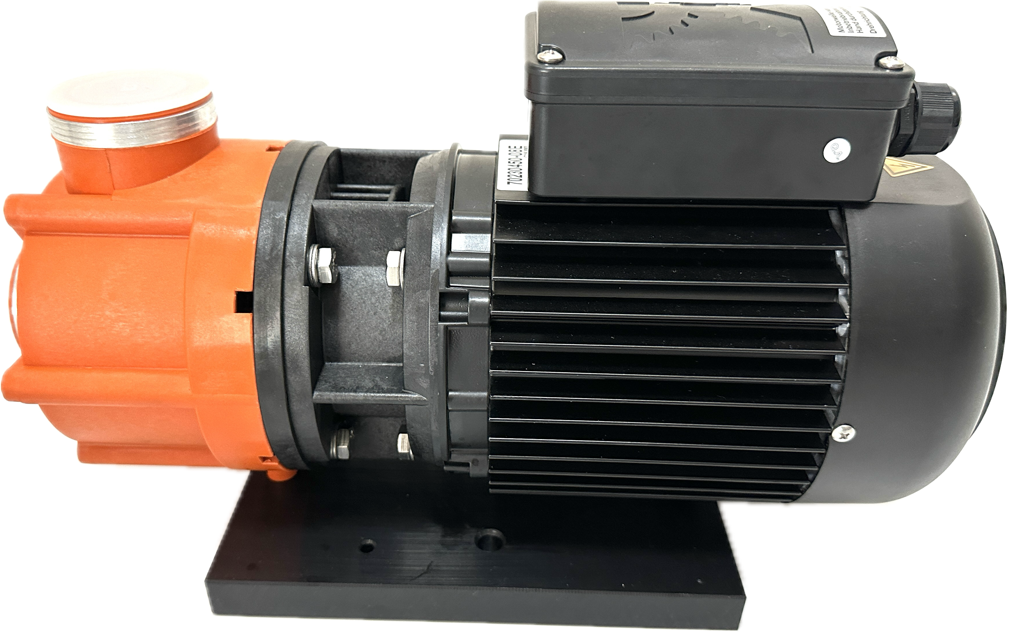 Monoblock-type pump with a closed bellows-type mechanical seal mounted on a plastic shaft protector sleeve. Motor/pump shaft has no contact with the pool water! Complete electrical separation.