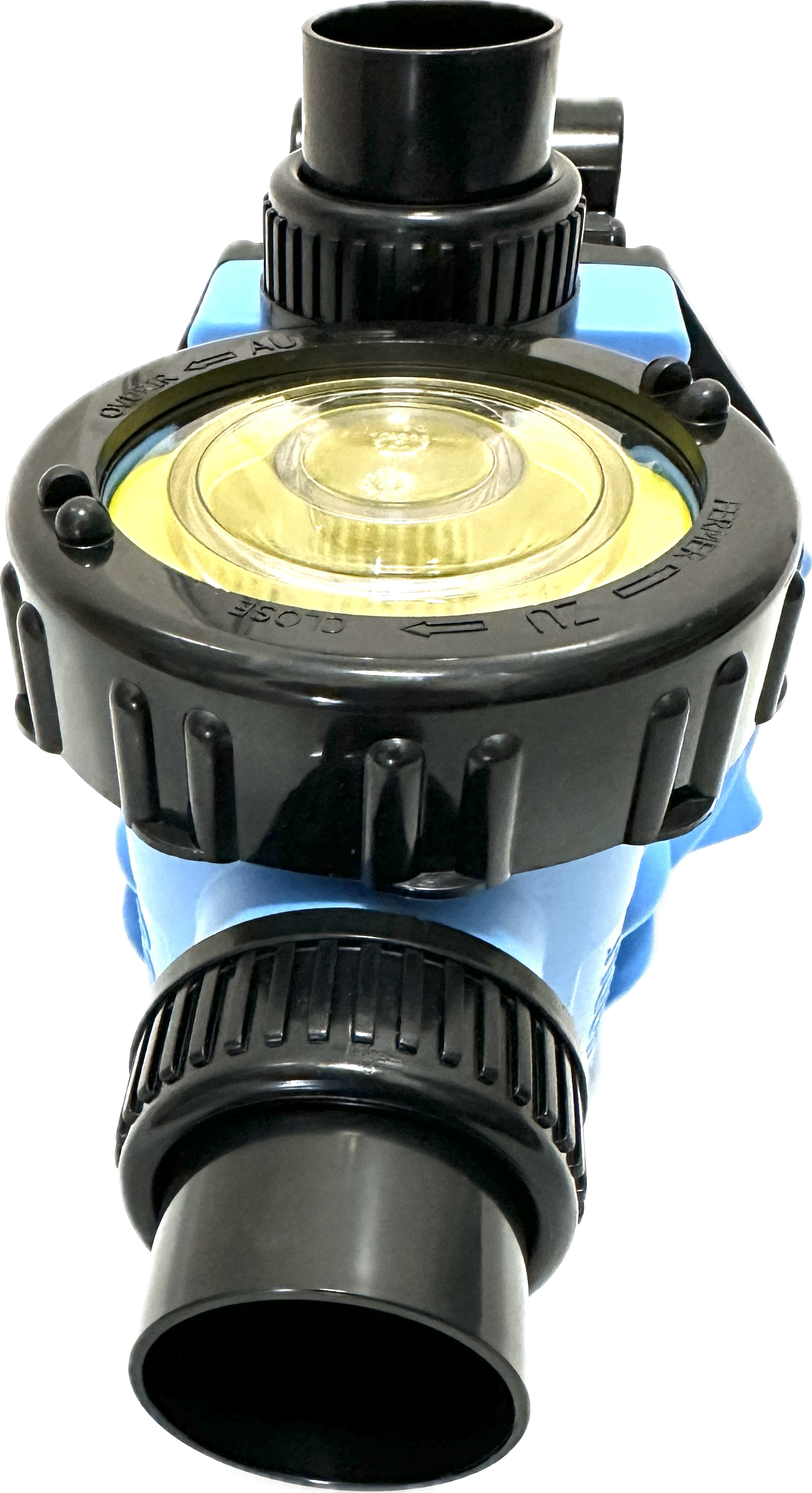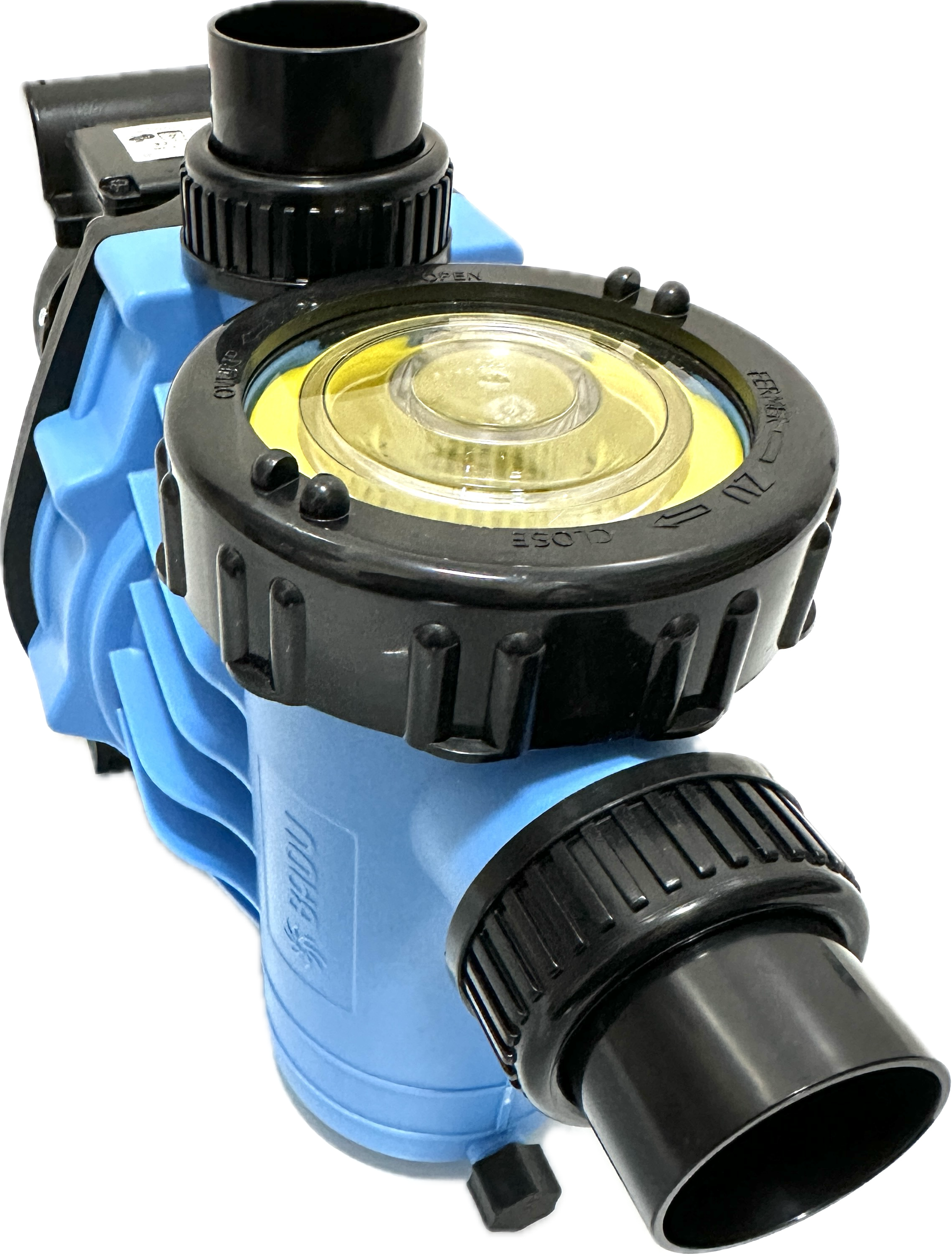 Monoblock-type pump with integrated strainer tank. The bellow-type mechanical seal is mounted on a plastic shaft protector sleeve. Motor/pump shaft has no contact with the pool water providing complete electrical separation.