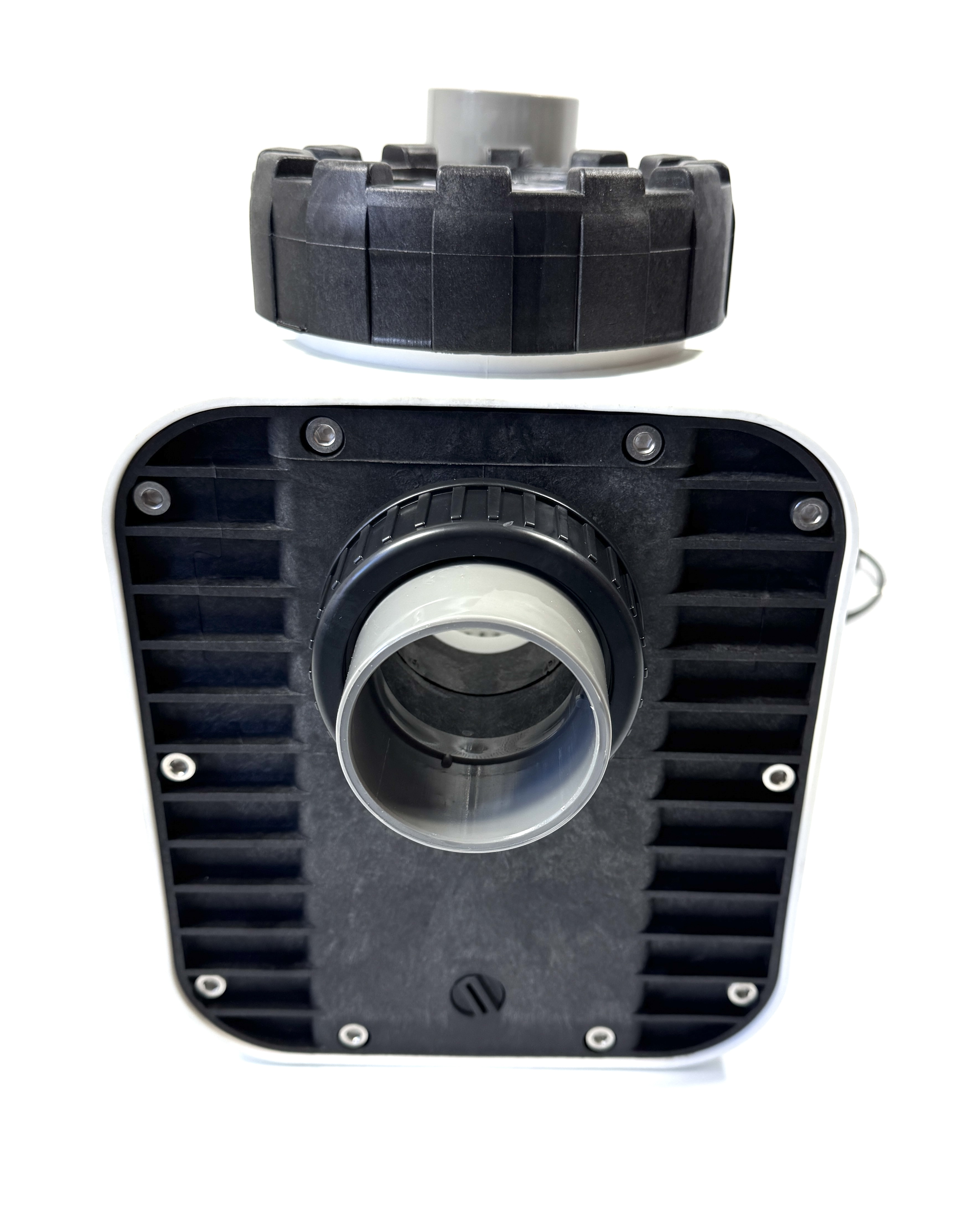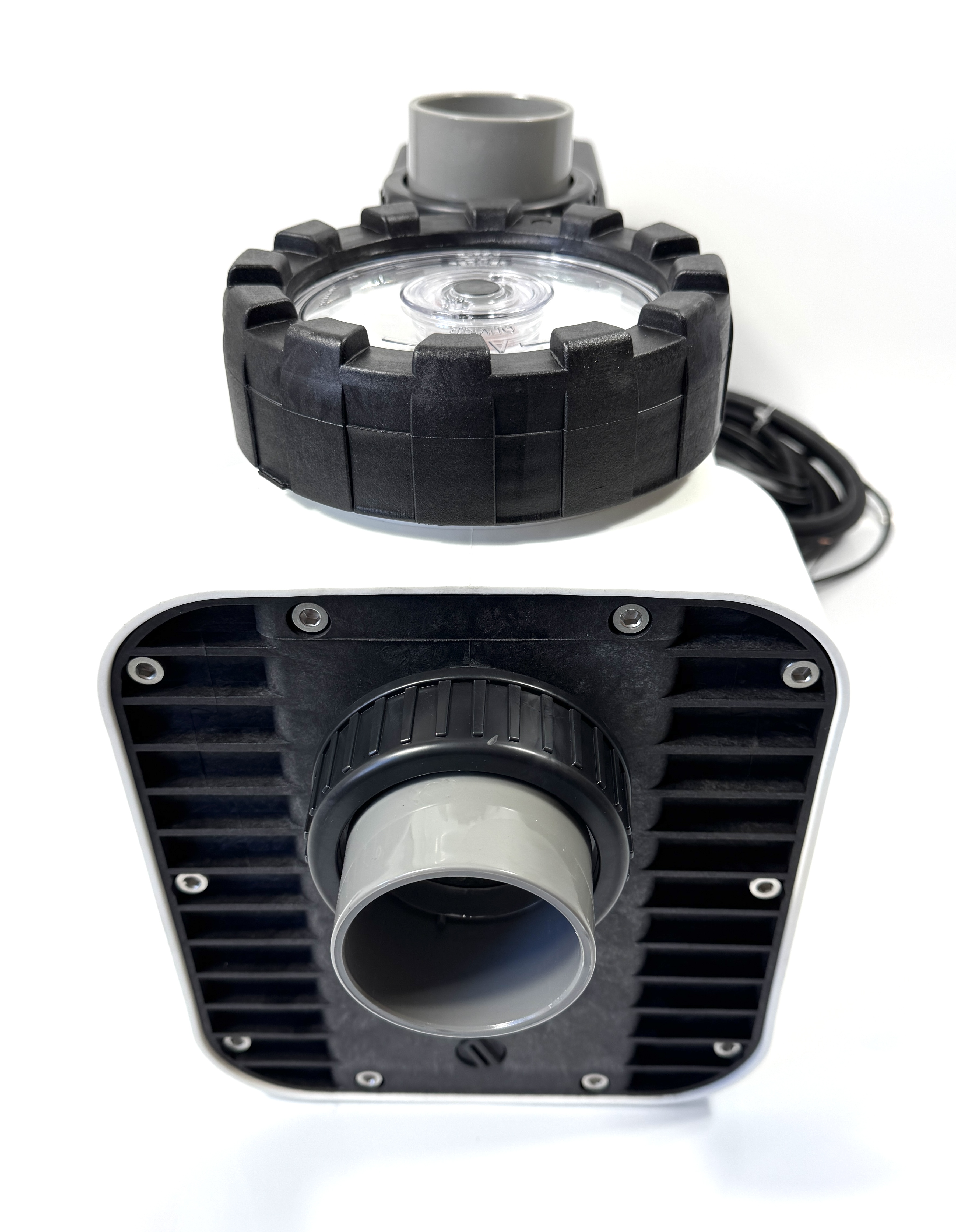 Monoblock-type pump with integrated strainer tank. The bellow-type mechanical seal is mounted on a plastic shaft protector sleeve. Motor/pump shaft has no contact with the pool water providing complete electrical separation.
