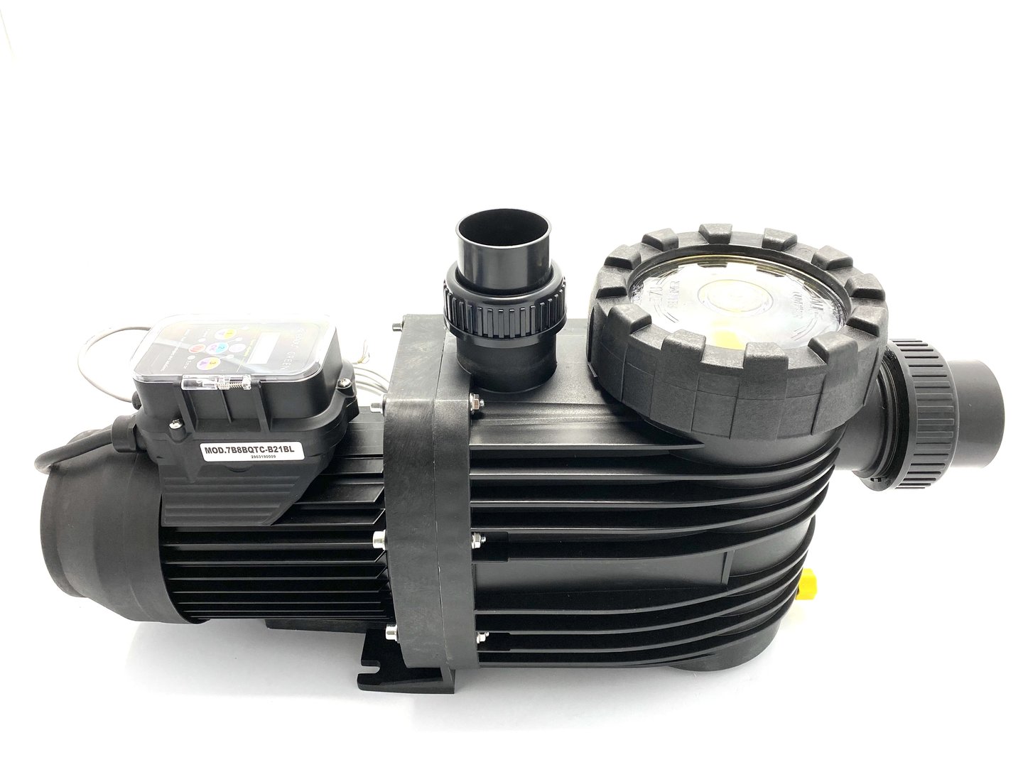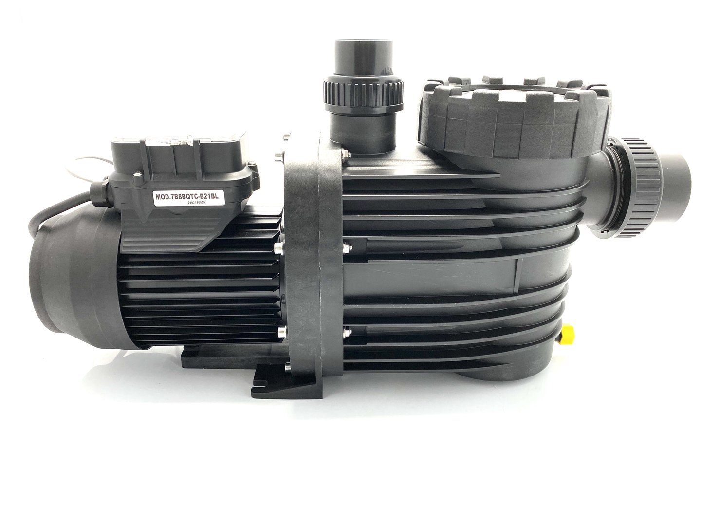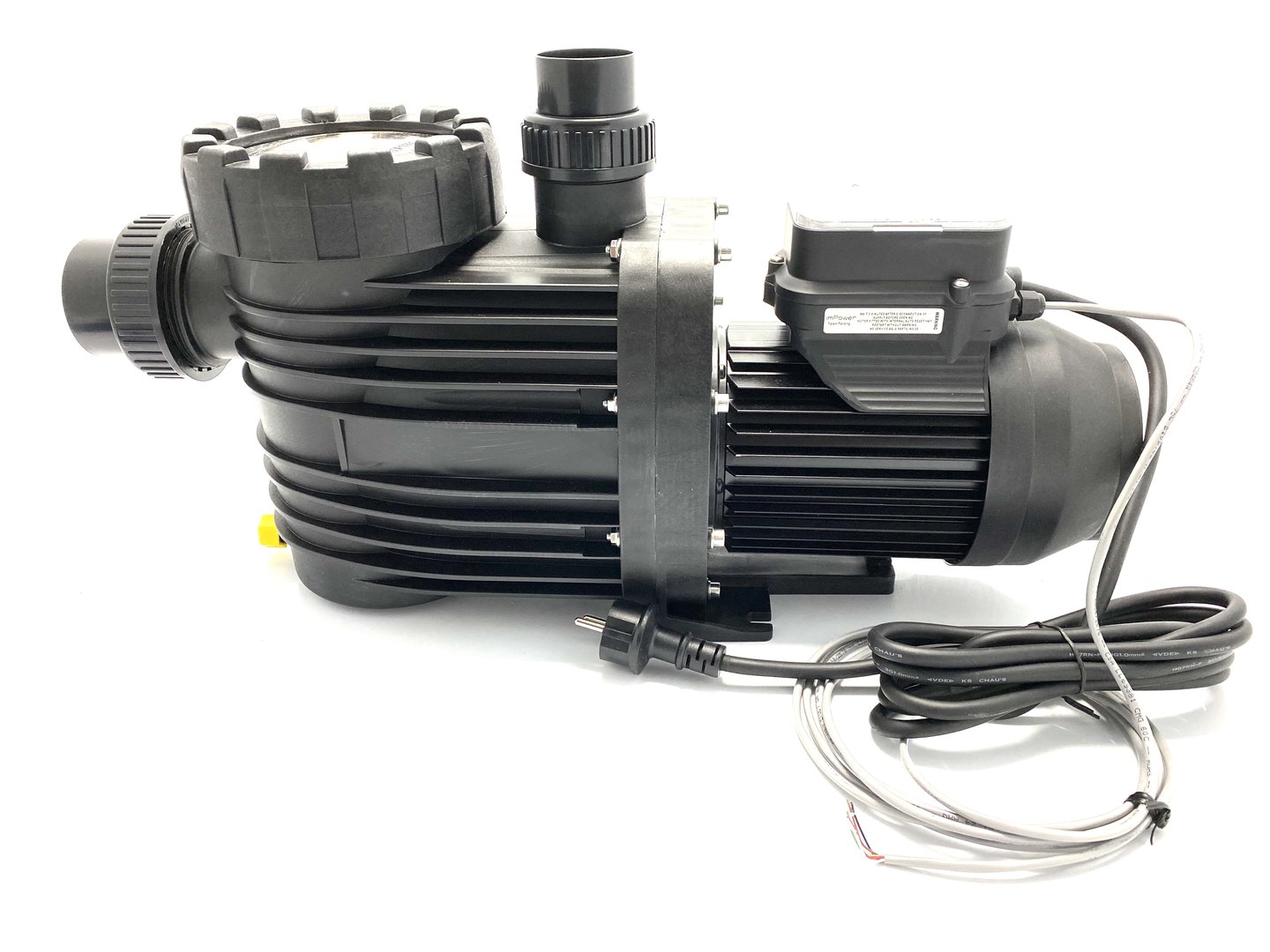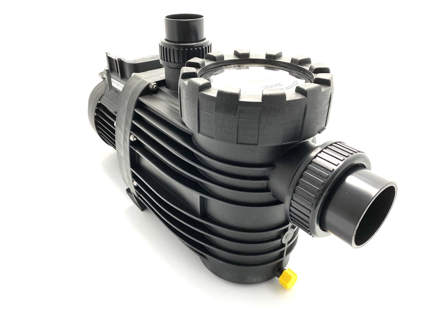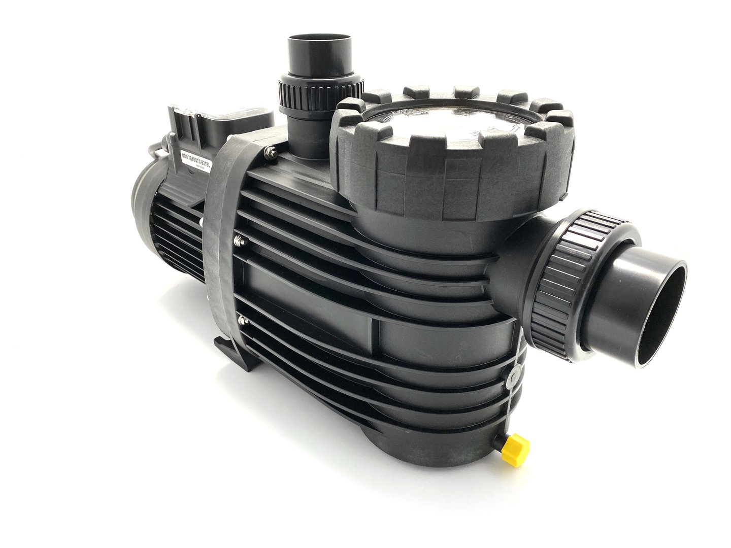 Monoblock-type pump with integrated strainer tank. The bellow-type mechanical seal is mounted on a plastic shaft protector sleeve. Motor/pump shaft has no contact with the pool water providing complete electrical separation.