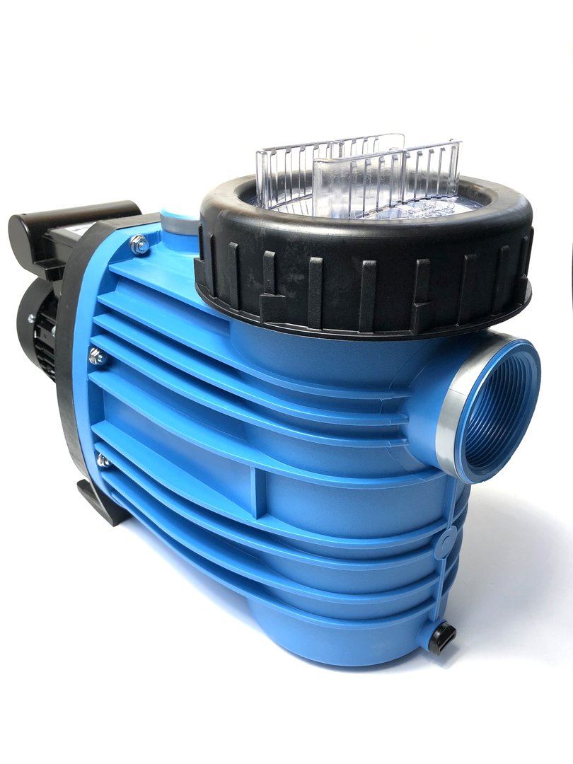 Monoblock-type pump with integrated strainer tank. The bellow-type mechanical seal is mounted on a plastic shaft protector sleeve. Motor/pump shaft has no contact with the pool water providing complete electrical separation.