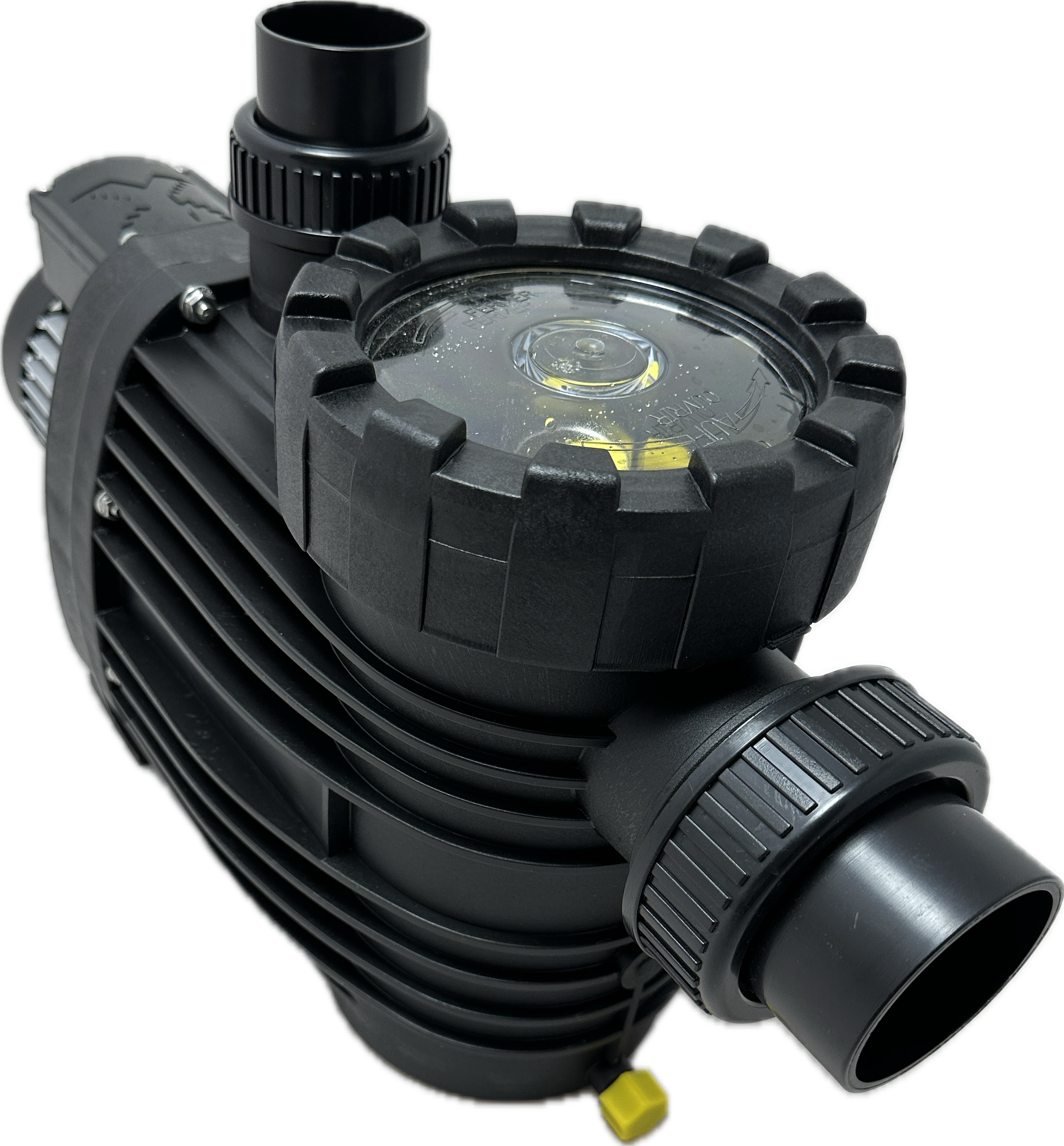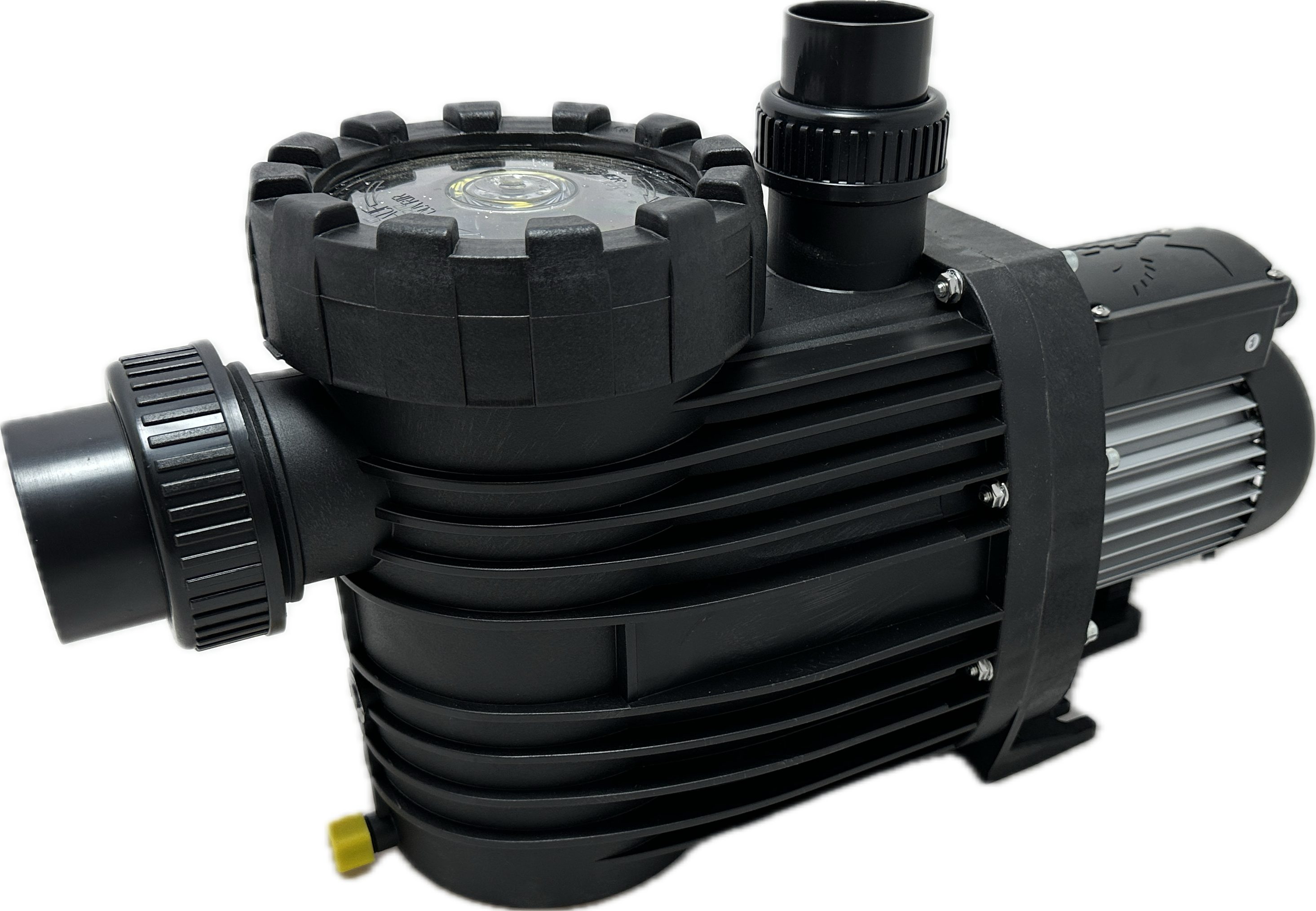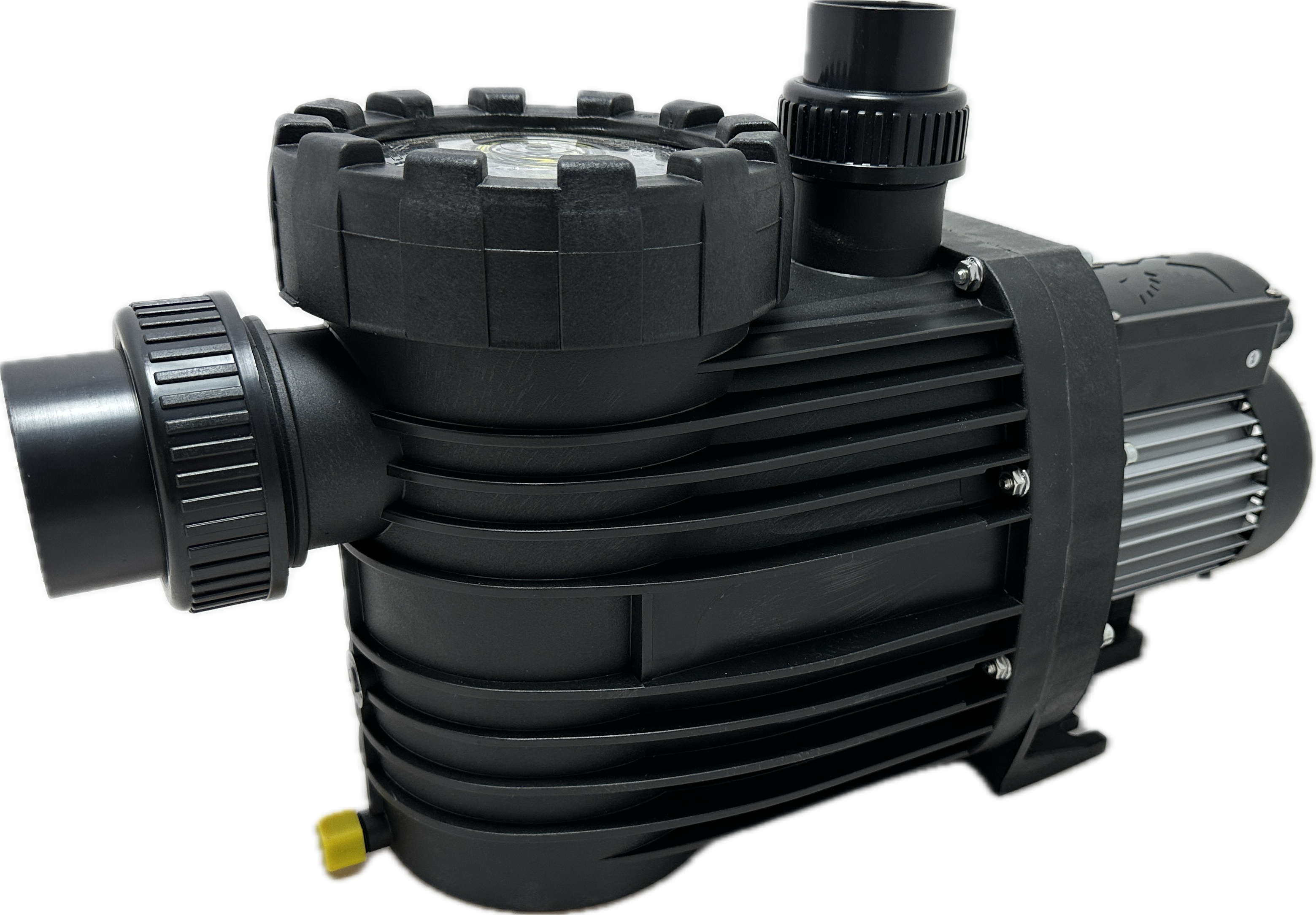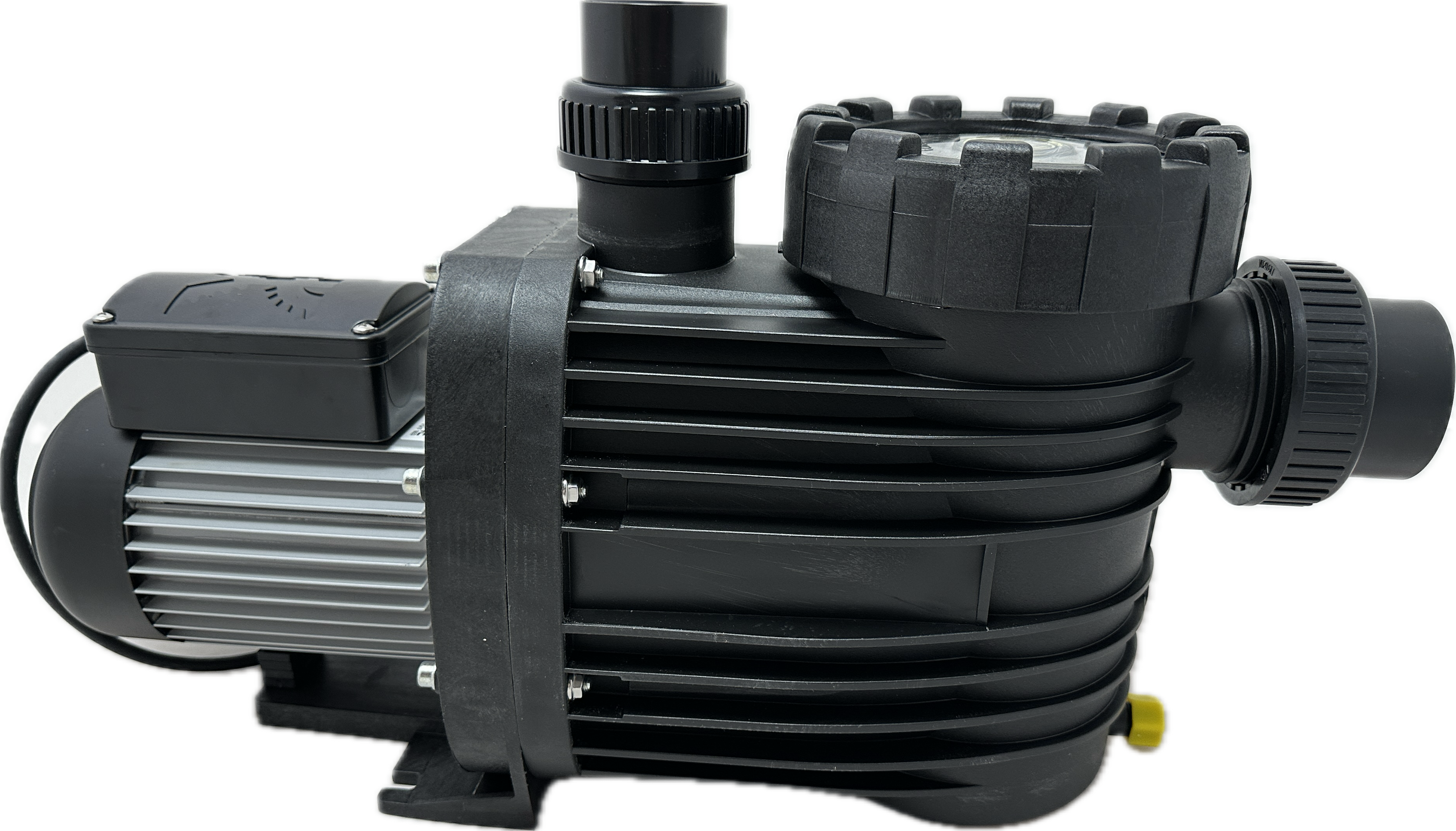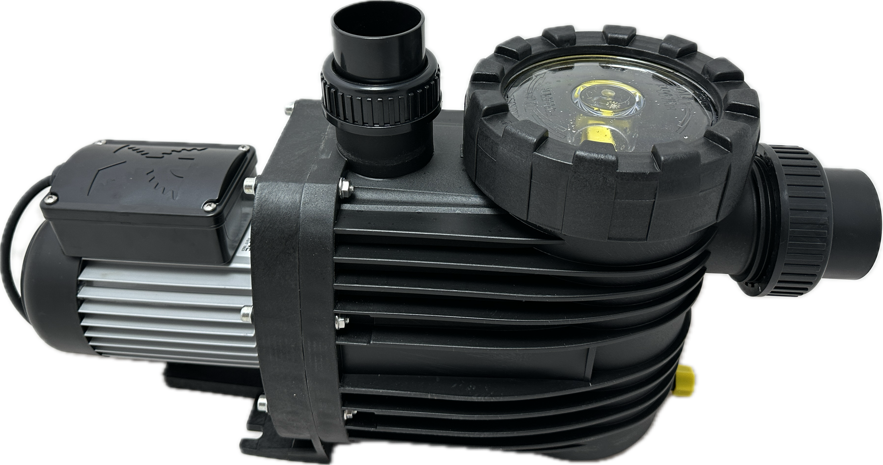 Monoblock-type pump with integrated strainer tank. The bellow-type mechanical seal is mounted on a plastic shaft protector sleeve. Motor/pump shaft has no contact with the pool water providing complete electrical separation.
