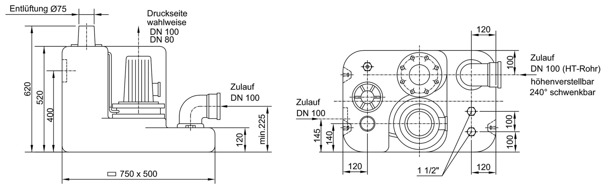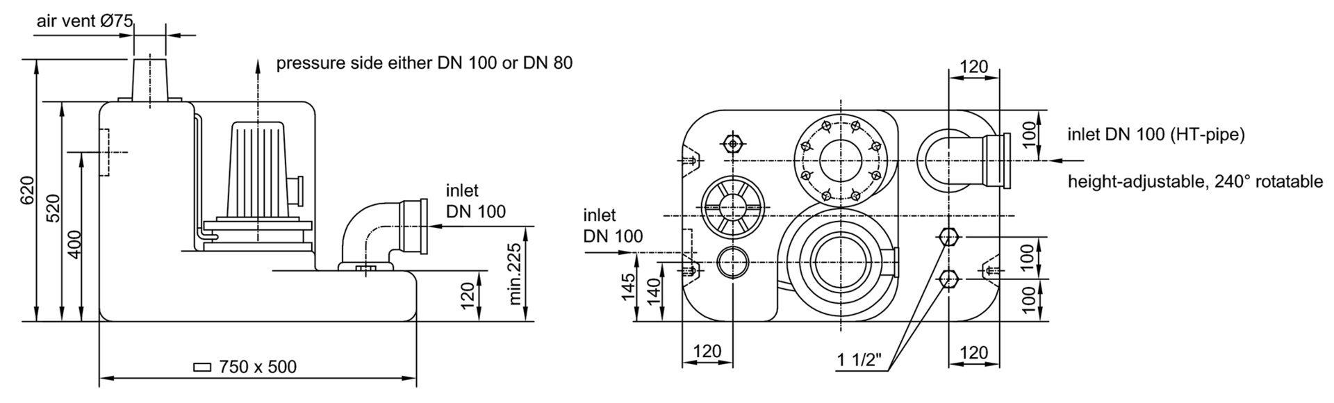 - connection flange piece DN 100 for pressure pipe (DN 80 optional)