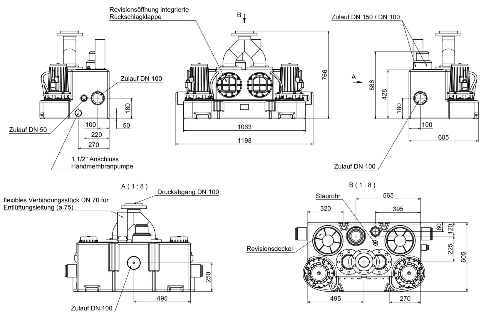 - Zulaufanschlüsse: seitlich 2 x DN 100 und 1 x DN 50, von hinten 1 x DN 100, von oben 1 x DN 100/150