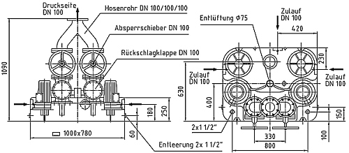 Doppelanlage mit 2 St. Rückschlagklappen DN 100, Hosenrohr DN 100/100/100, flexibler Verbindung mit Spannschellen für Entlüftungsleitung, Flanschstück DN 100 für Druckleitung sowie Steuerung ZPS 2