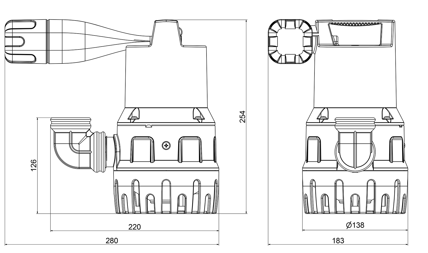 - inkl. 10 m Anschlusskabel und Schuko-Stecker, Rückschlagklappe, Anschlussbogen 90° 1¼“ IG